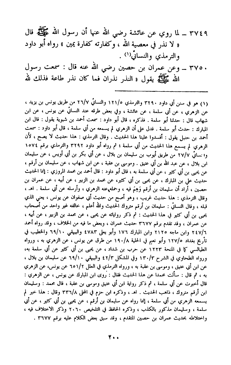 3750 - وعن عمران بن حصين - رَضِيَ اللَّهُ عَنْهُ - قال: سمعت رسول الله - صَلَّى اللَّهُ عَلَيْهِ وَسَلَّمَ - يقول: «النذر نذران فما كان نذر طاعة فذلك لله
