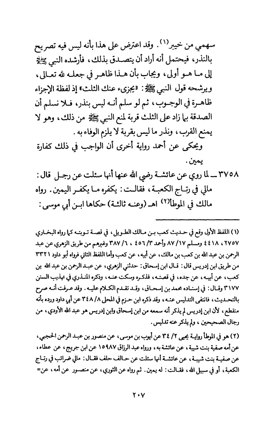 3758 - لما روي عن عائشة - رَضِيَ اللَّهُ عَنْهَا - أنها سئلت عن رجل قال: مالي في رتاج الكعبة، فقالت: يكفره ما يكفر اليمين. رواه مالك في الموطأ. اهـ. (وعنه ثالثة) حكاها ابن أبي موسى:
