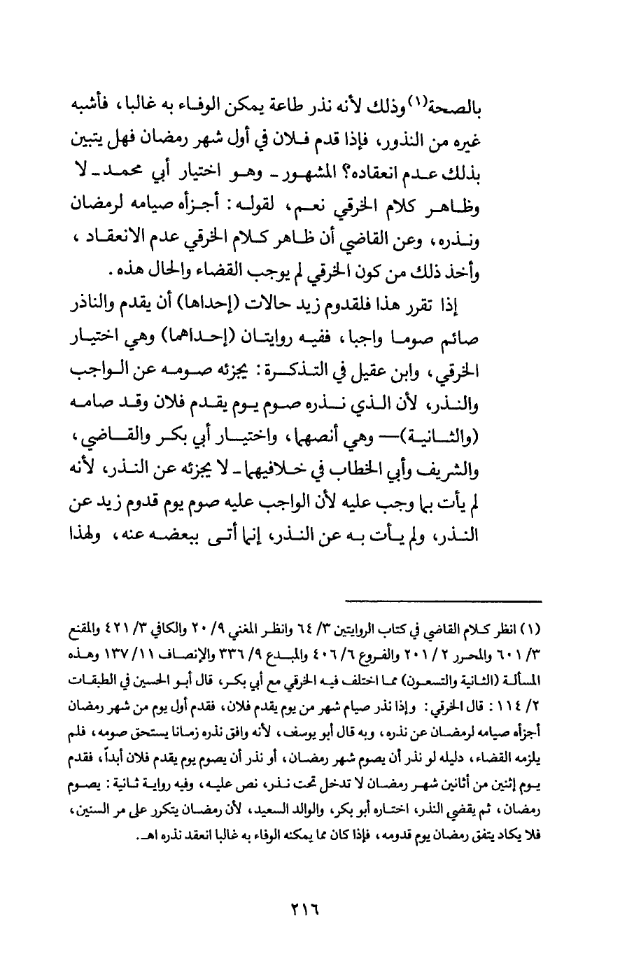 بالصحة وذلك لأنه نذر طاعة يمكن الوفاء به غالبا، فأشبه غيره من النذور، فإذا قدم فلان في أول شهر رمضان فهل يتبين بذلك عدم انعقاده؟ المشهور - وهو اختيار أبي محمد -: لا، وظاهر كلام الخرقي نعم؛ لقوله: أجزأه صيامه لرمضان ونذره؛ وعن القاضي أن ظاهر كلام الخرقي عدم الانعقاد، وأخذ ذلك من كون الخرقي لم يوجب القضاء والحال هذه.