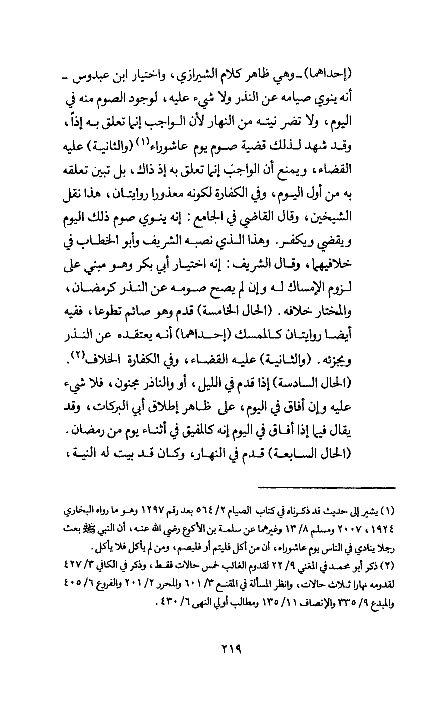 (إحداهما) - وهي ظاهر كلام الشيرازي، واختيار ابن عبدوس - أنه ينوي صيامه عن النذر ولا شيء عليه، لوجود الصوم منه في اليوم، ولا تضر نيته من النهار لأن الواجب إنما تعلق به إذا، وقد شهد لذلك قضية صوم يوم عاشوراء. (والثانية) : عليه القضاء، ويمنع أن الواجب إنما تعلق به إذ ذاك، بل تبين تعلقه به من أول اليوم، وفي الكفارة لكونه معذورا روايتان، هذا نقل الشيخين، وقال القاضي في الجامع: إنه ينوي صوم ذلك اليوم ويقضي ويكفر. وهذا الذي نصبه الشريف وأبو الخطاب في خلافيهما، وقال الشريف: إنه اختيار أبي بكر وهو مبني على لزوم الإمساك له وإن لم يصح صومه عن النذر كرمضان، والمختار خلافه.
