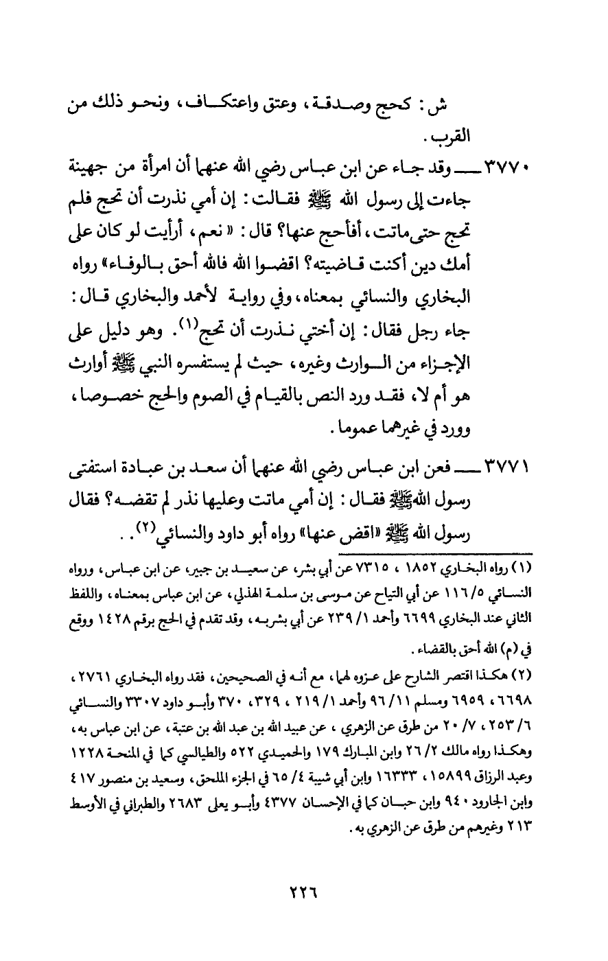 3770 - وقد جاء عن ابن عباس - رَضِيَ اللَّهُ عَنْهُمَا - أن «امرأة من جهينة جاءت إلى رسول الله - صَلَّى اللَّهُ عَلَيْهِ وَسَلَّمَ - فقالت: إن أمي نذرت أن تحج فلم تحج حتى ماتت، أفأحج عنها؟ قال: «نعم، أرأيت لو كان على أمك دين أكنت قاضيته؟ اقضوا الله فالله أحق بالوفاء» رواه البخاري والنسائي بمعناه، وفي رواية لأحمد والبخاري قال: جاء رجل فقال: إن أختي نذرت أن تحج. وهو دليل على الإجزاء من الوارث وغيره، حيث لم يستفسره النبي - صَلَّى اللَّهُ عَلَيْهِ وَسَلَّمَ - أوارث هو أم لا، فقد ورد النص بالقيام في الصوم والحج خصوصا، وورد في غيرهما عموما.