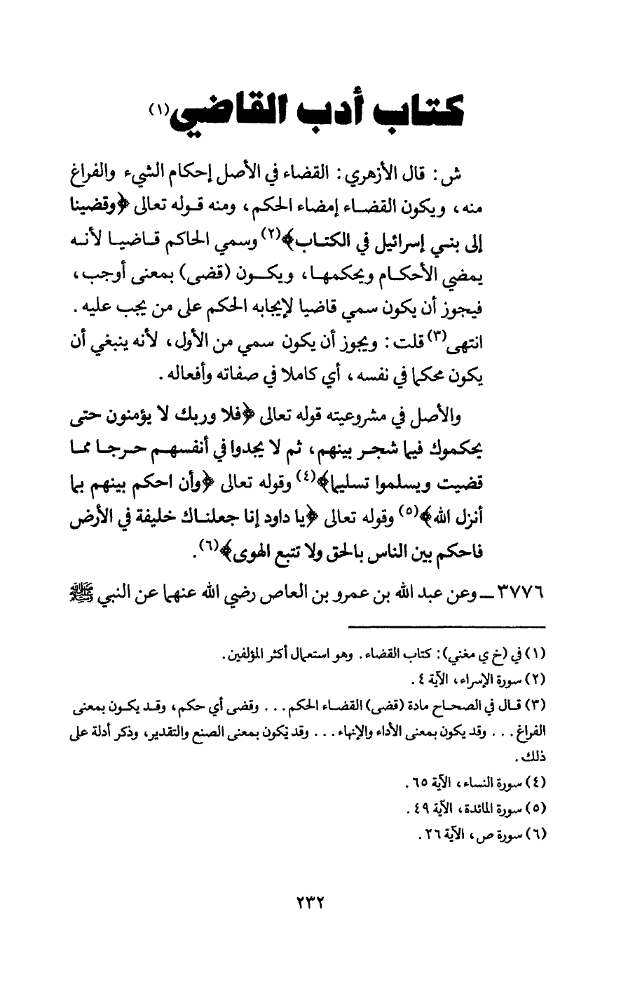 ش: قال الأزهري: القضاء في الأصل إحكام الشيء والفراغ منه، ويكون القضاء إمضاء الحكم، ومنه قَوْله تَعَالَى: {وَقَضَيْنَا إِلَى بَنِي إسْرائِيلَ فِي الْكِتَابِ} [الإسراء: 4] وسمي الحاكم قاضيا لأنه يمضي الأحكام ويحكمها، ويكون (قضى) بمعنى أوجب، فيجوز أن يكون سمي قاضيا لإيجابه الحكم على من يجب عليه. انتهى؛ قلت: ويجوز أن يكون سمي من الأول، لأنه ينبغي أن يكون محكما في نفسه، أي كاملا في صفاته وأفعاله.