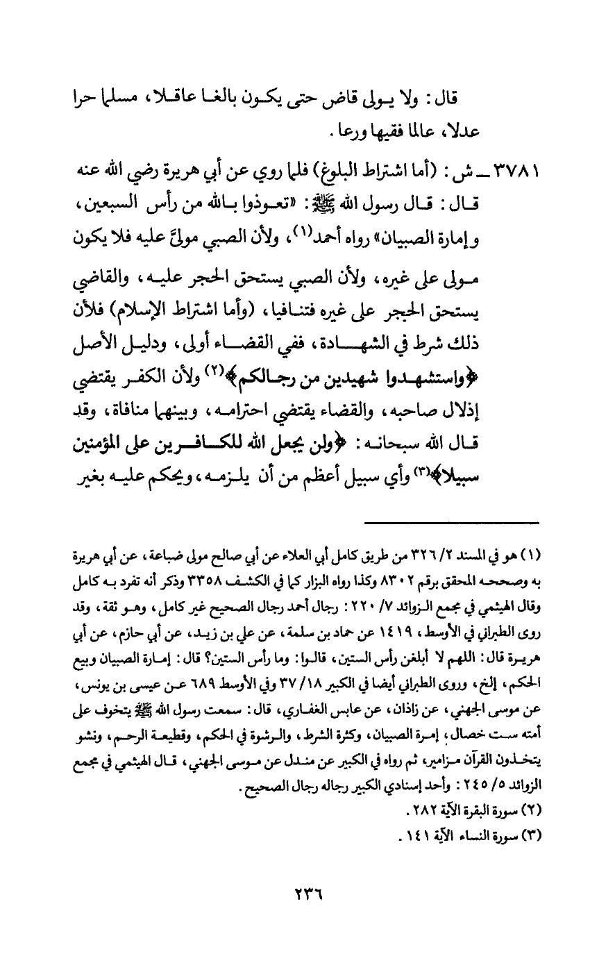 3781 - ش: (أما اشتراط البلوغ) فلما روي عن أبي هريرة - رَضِيَ اللَّهُ عَنْهُ - قال: قال رسول الله - صَلَّى اللَّهُ عَلَيْهِ وَسَلَّمَ -: «تعوذوا بالله من رأس السبعين، وإمارة الصبيان» رواه أحمد، ولأن الصبي مولى عليه فلا يكون مولى على غيره، ولأن الصبي يستحق الحجر عليه، والقاضي يستحق الحجر على غيره فتنافيا، (وأما اشتراط الإسلام) فلأن ذلك شرط في الشهادة، ففي القضاء أولى، ودليل الأصل: {وَاسْتَشْهِدُوا شَهِيدَيْنِ مِنْ رِجَالِكُمْ} [البقرة: 282] ولأن الكفر يقتضي إذلال صاحبه، والقضاء يقتضي احترامه، وبينهما منافاة، وقد قال الله سبحانه: {وَلَنْ يَجْعَلَ اللَّهُ لِلْكَافِرِينَ عَلَى الْمُؤْمِنِينَ سَبِيلًا} [النساء: 141] وأي سبيل أعظم من أن يلزمه، ويحكم عليه بغير