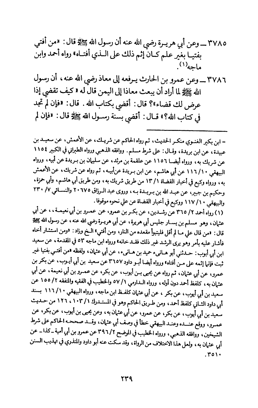 3785 - وعن أبي هريرة - رَضِيَ اللَّهُ عَنْهُ - أن رسول الله - صَلَّى اللَّهُ عَلَيْهِ وَسَلَّمَ - قال: «من أفتي بفتيا بغير علم كان إثم ذلك على الذي أفتاه» رواه أحمد وابن ماجه.