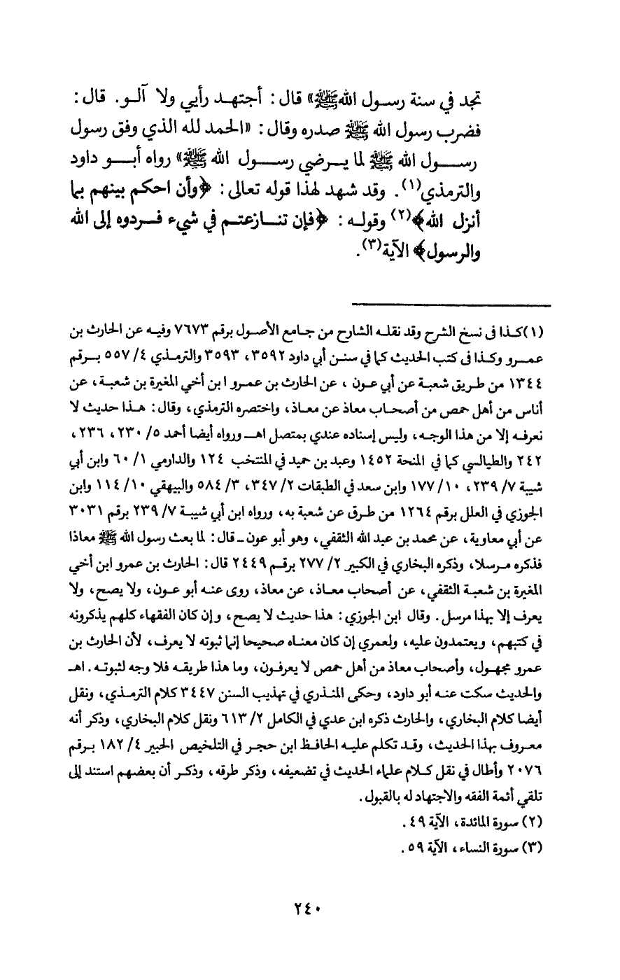 تجد في سنة رسول الله - صَلَّى اللَّهُ عَلَيْهِ وَسَلَّمَ - قال: أجتهد رأيي ولا آلو. قال: فضرب رسول الله - صَلَّى اللَّهُ عَلَيْهِ وَسَلَّمَ - صدره وقال: «الحمد لله الذي وفق رسول رسول الله - صَلَّى اللَّهُ عَلَيْهِ وَسَلَّمَ - لما يرضي رسول الله - صَلَّى اللَّهُ عَلَيْهِ وَسَلَّمَ -» -» رواه أبو داود والترمذي، وقد شهد لهذا قَوْله تَعَالَى: {وَأَنِ احْكُمْ بَيْنَهُمْ بِمَا أَنْزَلَ اللَّهُ} [المائدة: 49] وقوله: {فَإِنْ تَنَازَعْتُمْ فِي شَيْءٍ فَرُدُّوهُ إِلَى اللَّهِ وَالرَّسُولِ} [النساء: 59] الآية.
