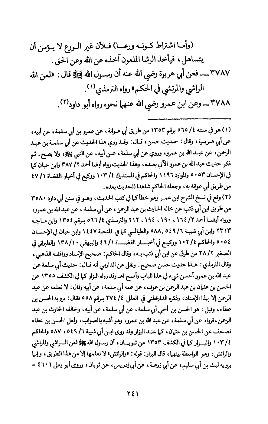 3787 - فعن أبي هريرة - رَضِيَ اللَّهُ عَنْهُ - أن رسول الله - صَلَّى اللَّهُ عَلَيْهِ وَسَلَّمَ - قال: «لعن الله الراشي والمرتشي في الحكم» رواه الترمذي.