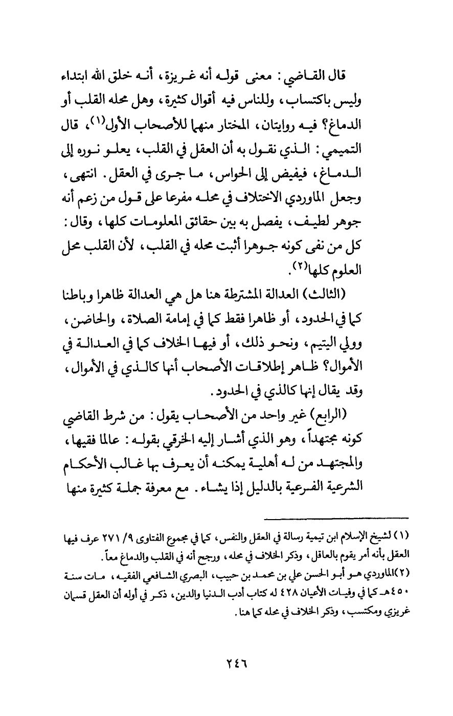 (الرابع) غير واحد من الأصحاب يقول: من شرط القاضي كونه مجتهدا، وهو الذي أشار إليه الخرقي بقوله: عالما فقيها، والمجتهد من له أهلية يمكنه أن يعرف بها غالب الأحكام الشرعية الفرعية بالدليل إذا يشاء. مع معرفة جملة كثيرة منها