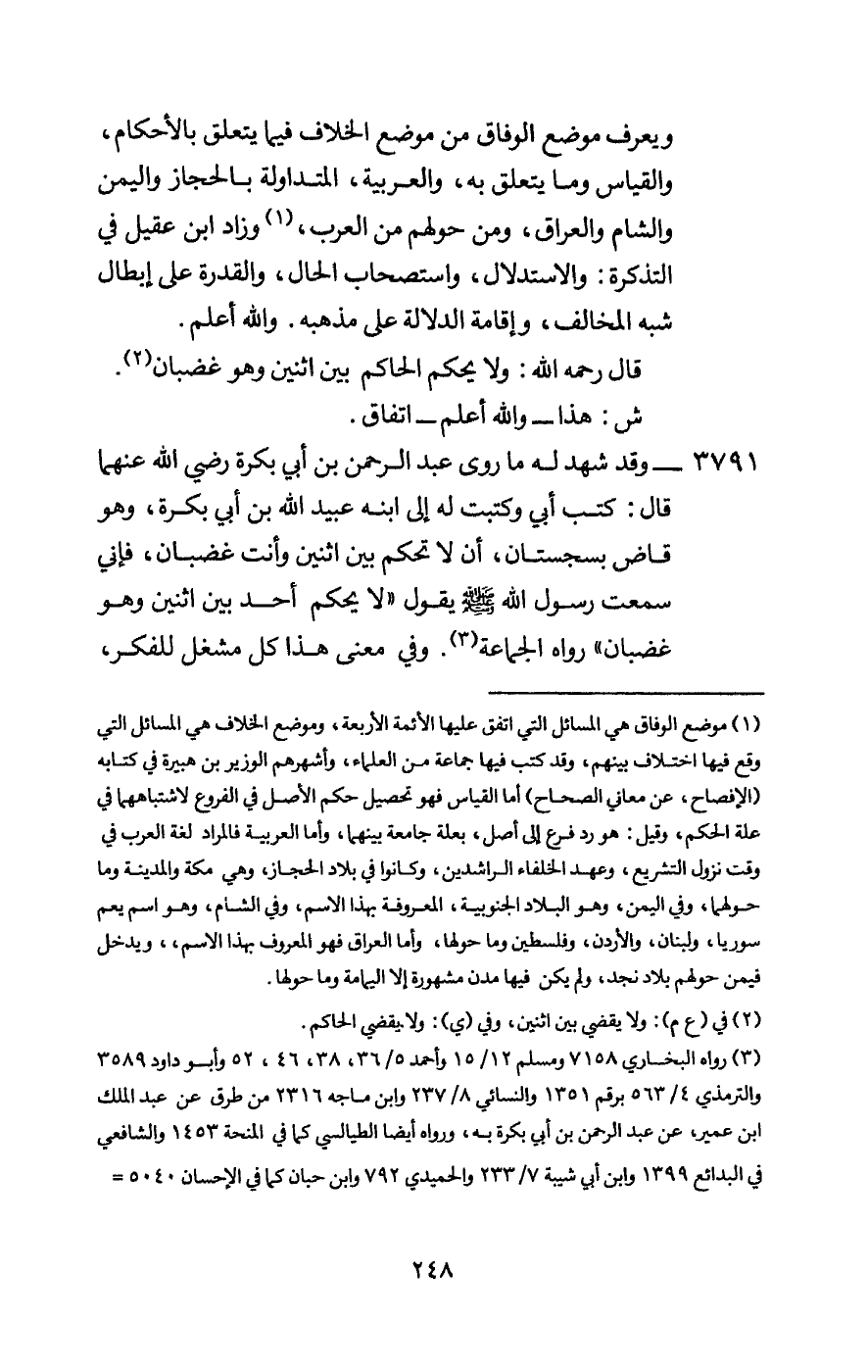 3791 - وقد شهد له ما روى «عبد الرحمن بن أبي بكرة - رَضِيَ اللَّهُ عَنْهُمَا - قال: كتب أبي وكتبت له إلى ابنه عبيد الله بن أبي بكرة، وهو قاض بسجستان، أن لا تحكم بين اثنين وأنت غضبان، فإني سمعت رسول الله - صَلَّى اللَّهُ عَلَيْهِ وَسَلَّمَ - يقول: «لا يحكم أحد بين اثنين وهو غضبان» رواه الجماعة. وفي معنى هذا كل مشغل للفكر،