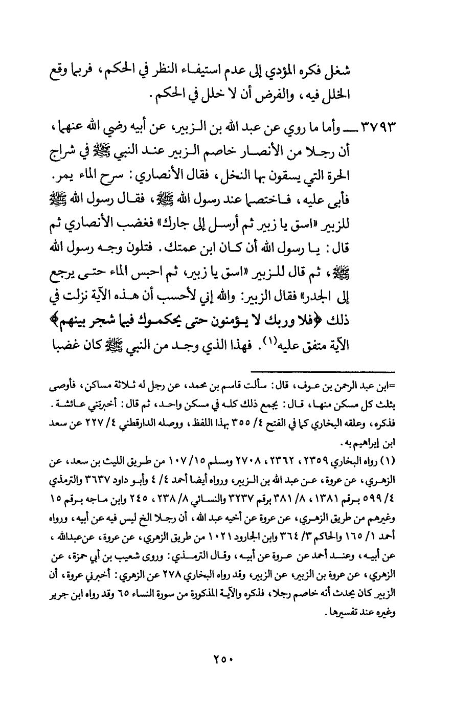 3793 - وأما ما روي عن عبد الله بن الزبير، عن أبيه - رَضِيَ اللَّهُ عَنْهُمَا -، أن «رجلا من الأنصار خاصم الزبير عند النبي - صَلَّى اللَّهُ عَلَيْهِ وَسَلَّمَ - في شراج الحرة التي يسقون بها النخل، فقال الأنصاري: سرح الماء يمر. فأبى عليه، فاختصما عند رسول الله - صَلَّى اللَّهُ عَلَيْهِ وَسَلَّمَ -، فقال رسول الله - صَلَّى اللَّهُ عَلَيْهِ وَسَلَّمَ - للزبير: «اسق يا زبير ثم أرسل إلى جارك» ، فغضب الأنصاري ثم قال: يا رسول الله أن كان ابن عمتك، فتلون وجه رسول الله - صَلَّى اللَّهُ عَلَيْهِ وَسَلَّمَ -، ثم قال للزبير: «اسق يا زبير، ثم احبس الماء حتى يرجع إلى الجدر» ، فقال الزبير: والله إني لأحسب أن هذه الآية نزلت في ذلك: {فَلَا وَرَبِّكَ لَا يُؤْمِنُونَ حَتَّى يُحَكِّمُوكَ فِيمَا شَجَرَ بَيْنَهُمْ} [النساء: 65] الآية» متفق عليه. فهذا الذي وجد من النبي - صَلَّى اللَّهُ عَلَيْهِ وَسَلَّمَ - كان غضبا