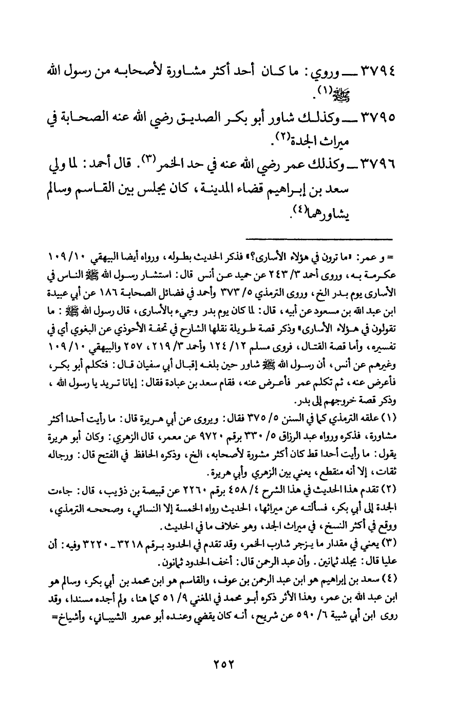 3796 - وكذلك عمر - رَضِيَ اللَّهُ عَنْهُ - في حد الخمر. قال أحمد: لما ولي سعد بن إبراهيم قضاء المدينة، كان يجلس بين القاسم وسالم يشاورهما