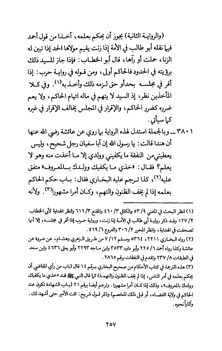 3801 - وبالجملة استدل لهذه الرواية بما روي عن عائشة - رَضِيَ اللَّهُ عَنْهَا - أن «هندا قالت: يا رسول الله إن أبا سفيان رجل شحيح، وليس يعطيني من النفقة ما يكفيني وولدي إلا ما أخذت منه وهو لا يعلم؟ فقال: «خذي ما يكفيك وولدك بالمعروف» متفق عليه، كذا ترجم عليه البخاري فقال: باب حكم الحاكم بعلمه إذا لم يخف الظنون والتهم، وكان أمرا مشهورا؛ ولأنه