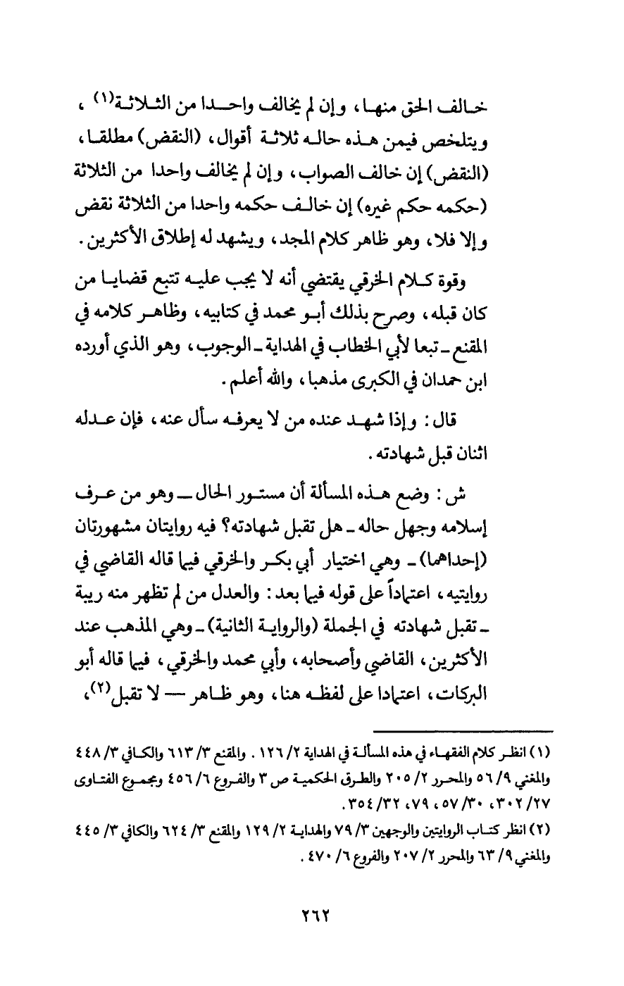 ش: وضع هذه المسألة أن مستور الحال - وهو من عرف إسلامه وجهل حاله - هل تقبل شهادته؟ فيه روايتان مشهورتان (إحداهما) - وهي اختيار أبي بكر والخرقي فيما قاله القاضي في روايتيه، اعتمادا على قوله فيما بعد: والعدل من لم تظهر منه ريبة - تقبل شهادته في الجملة (والرواية الثانية) - وهي المذهب عند الأكثرين، القاضي وأصحابه، وأبي محمد والخرقي، فيما قاله أبو البركات، اعتمادا على لفظه هنا، وهو ظاهر - لا تقبل،