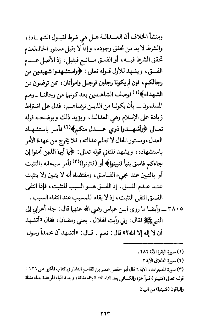 3805 - وأيضا ما روى ابن عباس - رَضِيَ اللَّهُ عَنْهُمَا - قال: «جاء أعرابي إلى النبي - صَلَّى اللَّهُ عَلَيْهِ وَسَلَّمَ - فقال: إني رأيت الهلال. يعني رمضان، فقال: «أتشهد أن لا إله إلا الله؟» قال: نعم. قال: «أتشهد أن محمدا رسول
