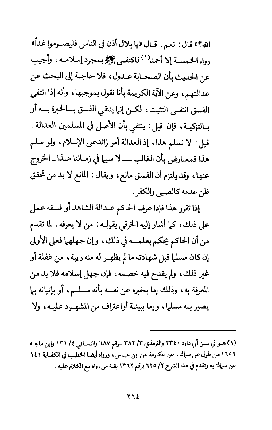 الله؟» قال: نعم. قال: «يا بلال أذن في الناس فليصوموا غدا» رواه الخمسة إلا أحمد فاكتفى - صَلَّى اللَّهُ عَلَيْهِ وَسَلَّمَ - بمجرد إسلامه، وأجيب عن الحديث بأن الصحابة عدول، فلا حاجة إلى البحث عن عدالتهم، وعن الآية الكريمة بأنا نقول بموجبها، وأنه إذا انتفى الفسق انتفى التثبت، لكن إنما ينتفي الفسق بالخبرة به أو بالتزكية، فإن قيل: ينتفي بأن الأصل في المسلمين العدالة.