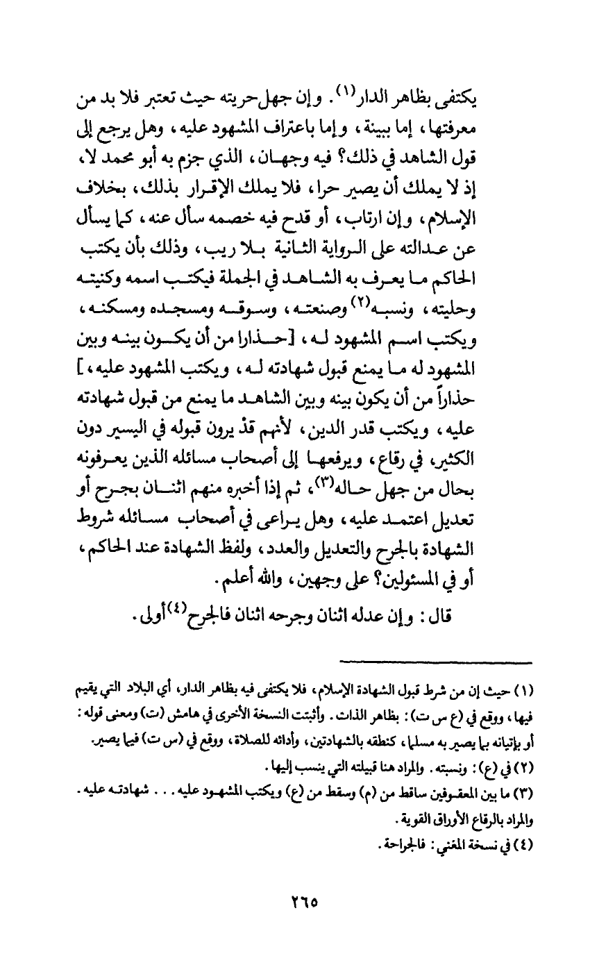 يكتفى بظاهر الدار. وإن جهل حريته حيث تعتبر فلا بد من معرفتها، إما ببينة، وإما باعتراف المشهود عليه، وهل يرجع إلى قول الشاهد في ذلك؟ فيه وجهان، الذي جزم به أبو محمد لا، إذ لا يملك أن يصير حرا، فلا يملك الإقرار بذلك، بخلاف الإسلام، وإن ارتاب، أو قدح فيه خصمه سأل عنه، كما يسأل عن عدالته على الرواية الثانية بلا ريب، وذلك بأن يكتب الحاكم ما يعرف به الشاهد في الجملة فيكتب اسمه وكنيته وحليته، ونسبه وصنعته، وسوقه ومسجده ومسكنه، ويكتب اسم المشهود له، [حذارا من أن يكون بينه وبين المشهود له ما يمنع قبول شهادته له، ويكتب المشهود عليه] حذارا من أن يكون بينه وبين الشاهد ما يمنع من قبول شهادته عليه، ويكتب قدر الدين، لأنهم قد يرون قبوله في اليسير دون الكثير، في رقاع، ويرفعها إلى أصحاب مسائله الذين يعرفونه بحال من جهل حاله، ثم إذا أخبره منهم اثنان بجرح أو تعديل اعتمد عليه، وهل يراعى في أصحاب مسائله شروط الشهادة بالجرح والتعديل والعدد، ولفظ الشهادة عند الحاكم أو في المسؤولين؟ على وجهين، والله أعلم.