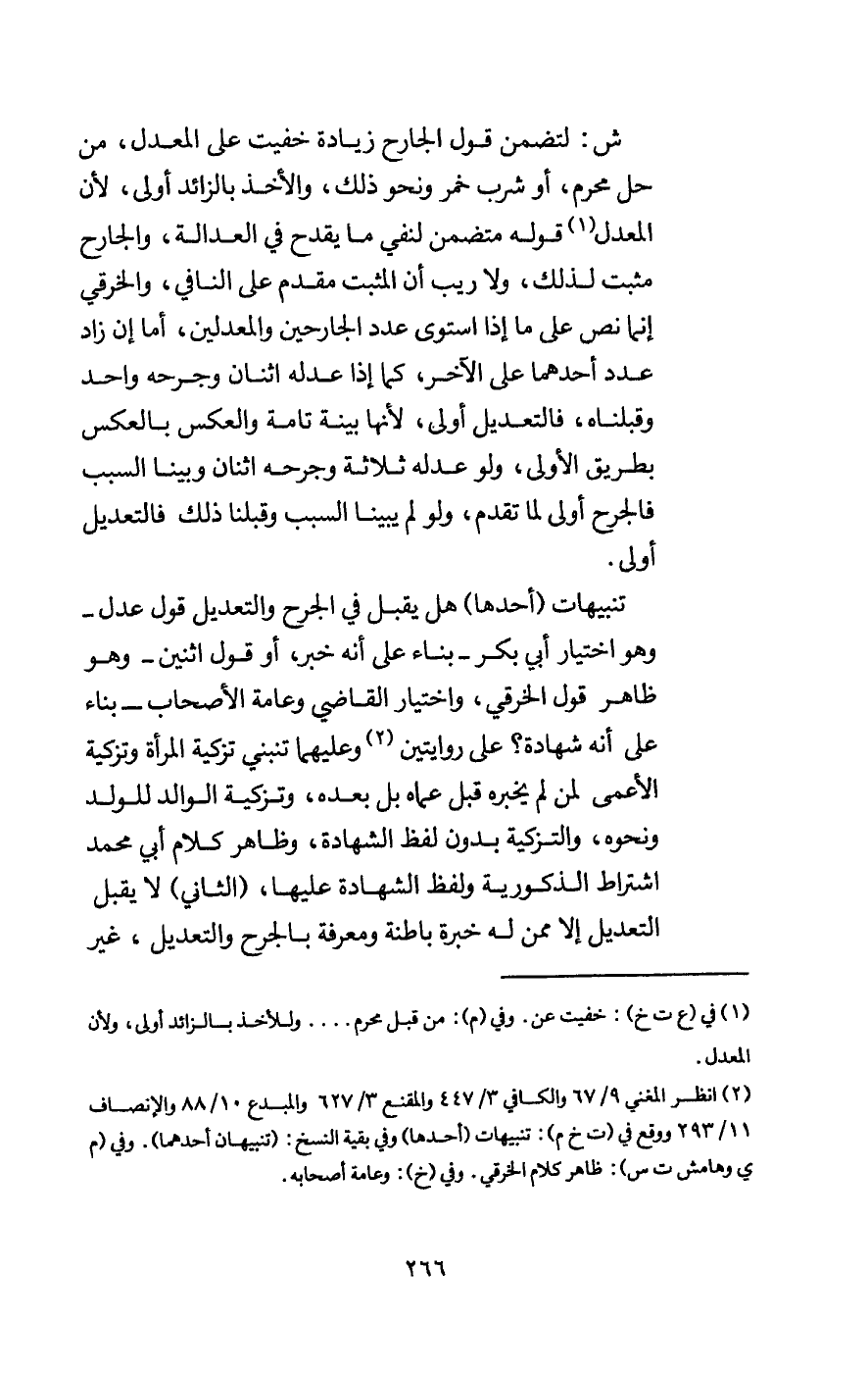 ش: لتضمن قول الجارح زيادة خفيت على المعدل، من محل محرم، أو شرب خمر ونحو ذلك، والأخذ بالزائد أولى، لأن المعدل قوله متضمن لنفي ما يقدح في العدالة، والجارح مثبت لذلك، ولا ريب أن المثبت مقدم على النافي، والخرقي إنما نص على ما إذا استوى عدد الجارحين والمعدلين، أما إن زاد عدد أحدهما على الآخر، كما إذا عدله اثنان وجرحه واحد وقبلناه، فالتعديل أولى، لأنها بينة تامة والعكس بالعكس بطريق الأولى، ولو عدله ثلاثة وجرحه اثنان وبينا السبب فالجرح أولى لما تقدم، ولو لم يبينا السبب وقبلنا ذلك فالتعديل أولى.