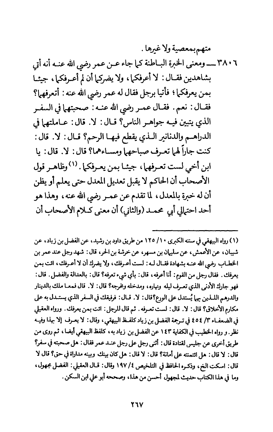 3806 - ومعنى الخبرة الباطنة كما جاء عن عمر - رَضِيَ اللَّهُ عَنْهُ - أنه أتي بشاهدين فقال: لا أعرفكما، ولا يضركما أن لم أعرفكما، جيئا بمن يعرفكما؛ فأتيا برجل فقال له عمر - رَضِيَ اللَّهُ عَنْهُ -: أتعرفهما؟ فقال: نعم. فقال عمر - رَضِيَ اللَّهُ عَنْهُ -: صحبتهما في السفر الذي يتبين فيه جواهر الناس؟ قال: لا. قال: عاملتهما في الدراهم والدنانير الذي يقطع فيها الرحم؟ قال: لا. قال: كنت جارا لهما تعرف صباحهما ومساءهما؟ قال: لا. قال يا ابن أخي لست تعرفهما، جيئا بمن يعرفكما.