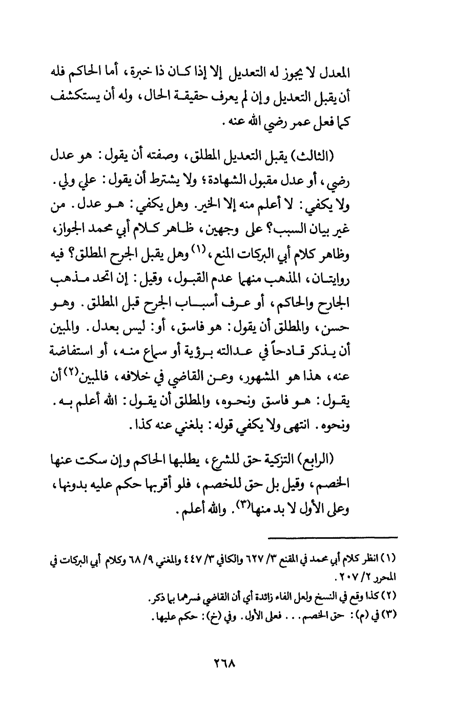 (الثالث) يقبل التعديل المطلق، وصفته أن يقول: هو عدل رضي، أو عدل مقبول الشهادة؛ ولا يشترط أن يقول: علي ولي. ولا يكفي: لا أعلم منه إلا الخير. وهل يكفي: هو عدل. من غير بيان السبب؟ على وجهين، ظاهر كلام أبي محمد الجواز، وظاهر كلام أبي البركات المنع، وهل يقبل الجرح المطلق؟ فيه روايتان، المذهب منهما عدم القبول، وقيل: إن اتحد مذهب الجارح والحاكم، أو عرف أسباب الجرح قبل المطلق. وهو حسن، والمطلق أن يقول: هو فاسق، أو: ليس بعدل. والمبين أن يذكر قادحا في عدالته برؤية أو سماع منه، أو استفاضة عنه، هذا هو المشهور، وعن القاضي في خلافه، فالمبين أن يقول: هو فاسق ونحوه، والمطلق أن يقول: الله أعلم به. ونحوه. انتهى ولا يكفي قوله: بلغني عنه كذا.