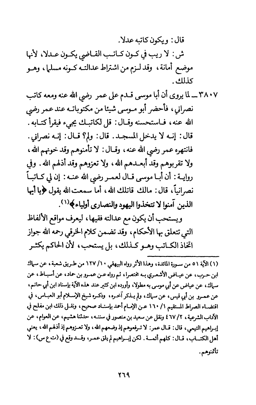 3807 - لما يروى أن أبا موسى قدم على عمر - رَضِيَ اللَّهُ عَنْهُ - ومعه كاتب نصراني، فأحضر أبو موسى شيئا من مكتوباته عند عمر - رَضِيَ اللَّهُ عَنْهُ -، فاستحسنه وقال: قل لكاتبك يجيء فيقرأ كتابه. قال: إنه لا يدخل المسجد. قال: ولم؟ قال: إنه نصراني. فانتهره عمر - رَضِيَ اللَّهُ عَنْهُ -، وقال: لا تأمنوهم وقد خونهم الله، ولا تقربوهم وقد أبعدهم الله، ولا تعزوهم وقد أذلهم الله. وفي رواية: أن أبا موسى قال لعمر - رَضِيَ اللَّهُ عَنْهُ -: إن لي كاتبا نصرانيا، قال: مالك قاتلك الله، أما سمعت الله يقول: {يَاأَيُّهَا الَّذِينَ آمَنُوا لَا تَتَّخِذُوا الْيَهُودَ وَالنَّصَارَى أَوْلِيَاءَ} [المائدة: 51] .