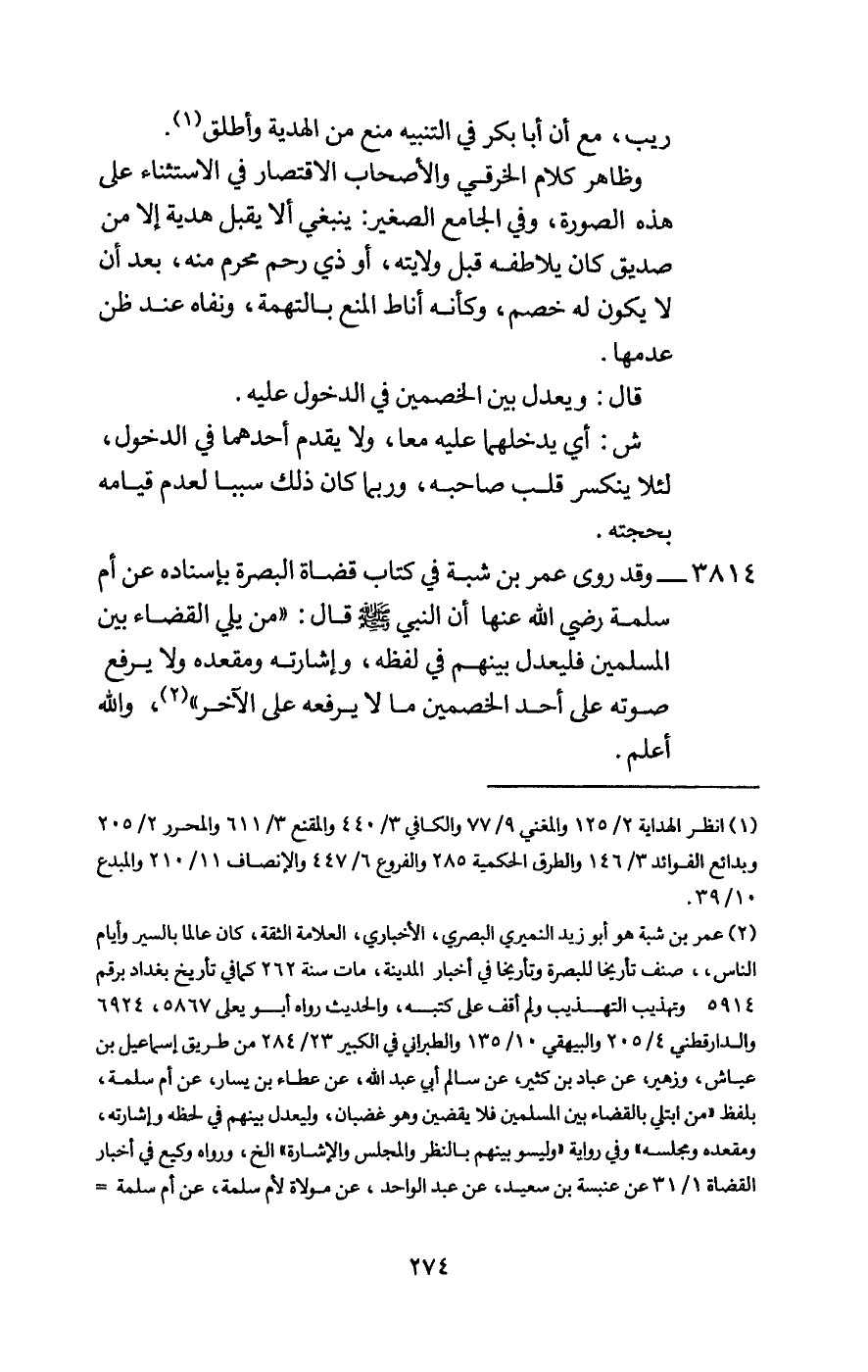 3814 - وقد روى عمر بن شيبة في كتاب قضاة البصرة بإسناده عن أم سلمة - رَضِيَ اللَّهُ عَنْهَا - أن النبي - صَلَّى اللَّهُ عَلَيْهِ وَسَلَّمَ - قال: «من يلي القضاء بين المسلمين فليعدل بينهم في لفظه، وإشارته ومقعده ولا يرفع صوته على أحد الخصمين ما لا يرفعه على الآخر» » ، والله أعلم.