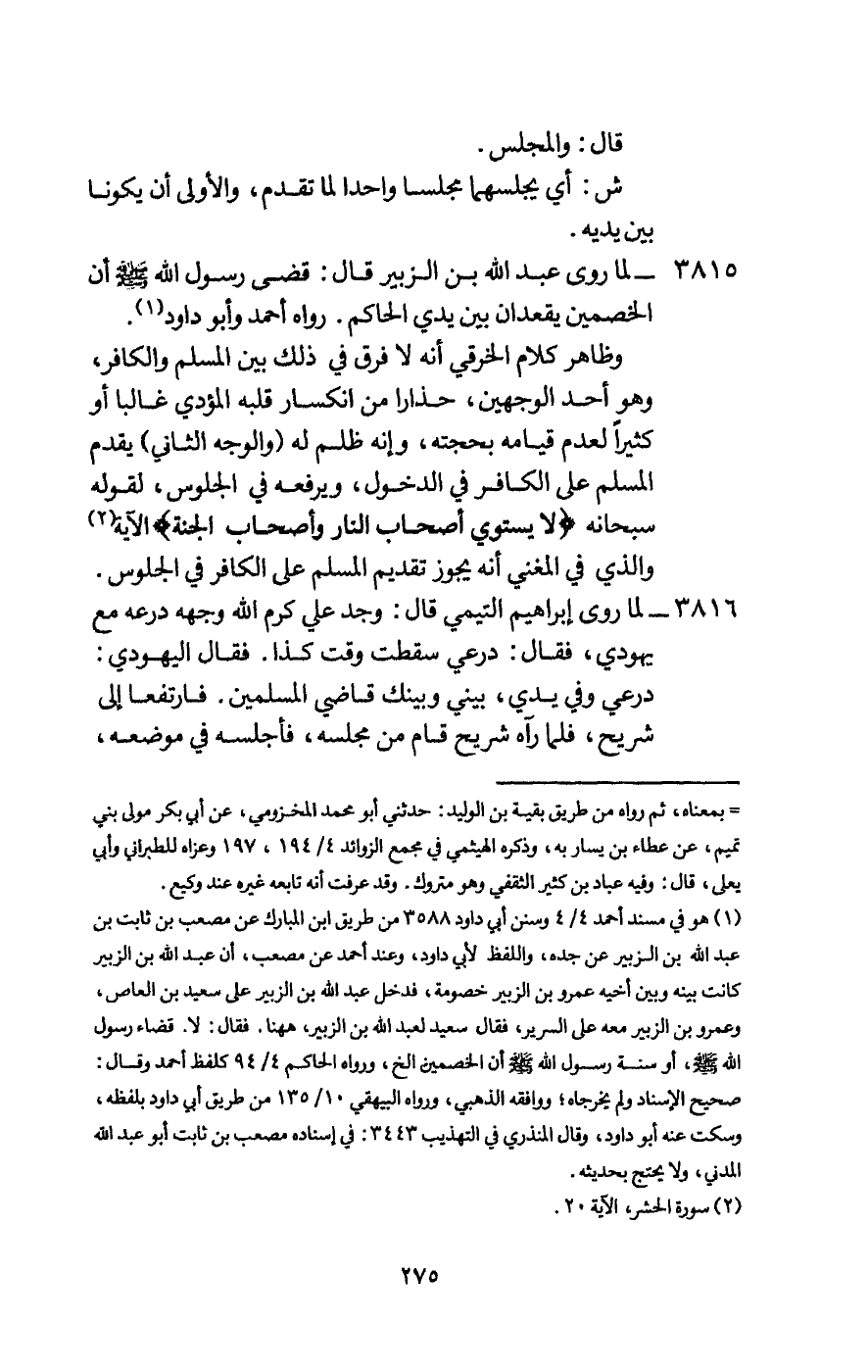 3815 - لما روى «عبد الله بن الزبير قال: قضى رسول الله - صَلَّى اللَّهُ عَلَيْهِ وَسَلَّمَ - أن الخصمين يقعدان بين يدي الحاكم» . رواه أحمد وأبو داود.