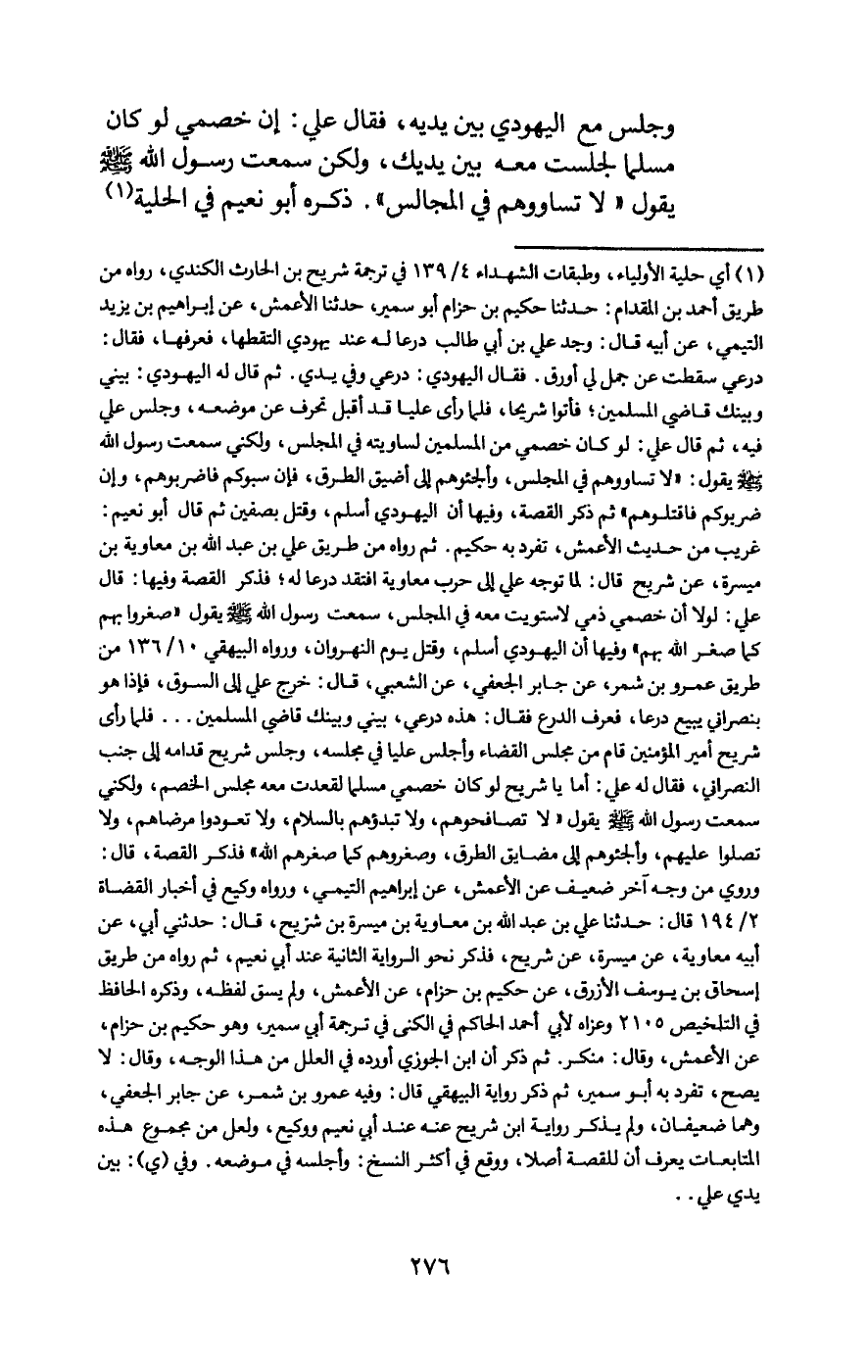 وجلس مع اليهودي بين يديه، فقال علي: إن خصمي لو كان مسلما لجلست معه بين يديك، ولكن سمعت رسول الله - صَلَّى اللَّهُ عَلَيْهِ وَسَلَّمَ - يقول: «لا تساووهم في المجالس» . ذكره أبو نعيم في الحلية