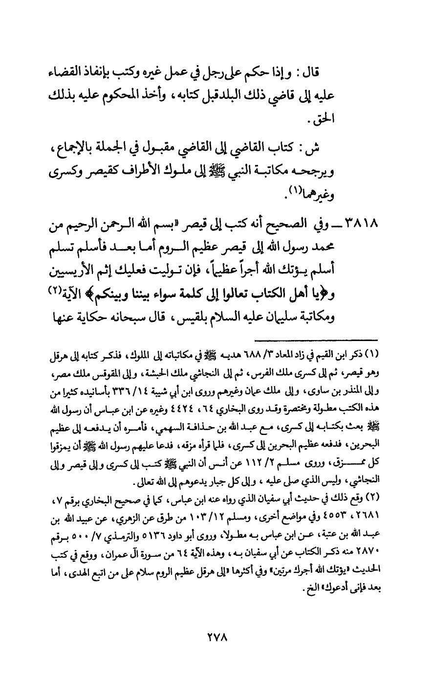 3818 - وفي الصحيح «أنه كتب إلى قيصر «بِسْمِ اللَّهِ الرَّحْمَنِ الرَّحِيمِ من محمد رسول الله - صَلَّى اللَّهُ عَلَيْهِ وَسَلَّمَ - إلى قيصر عظيم الروم أما بعد فأسلم تسلم أسلم يؤتك الله أجرا عظيما، فإن توليت فعليك إثم الأريسيين و {يَاأَهْلَ الْكِتَابِ تَعَالَوْا إِلَى كَلِمَةٍ سَوَاءٍ بَيْنَنَا وَبَيْنَكُمْ} [آل عمران: 64] الآية» ومكاتبة سليمان - عَلَيْهِ السَّلَامُ - بلقيس، قال سبحانه حكاية عنها