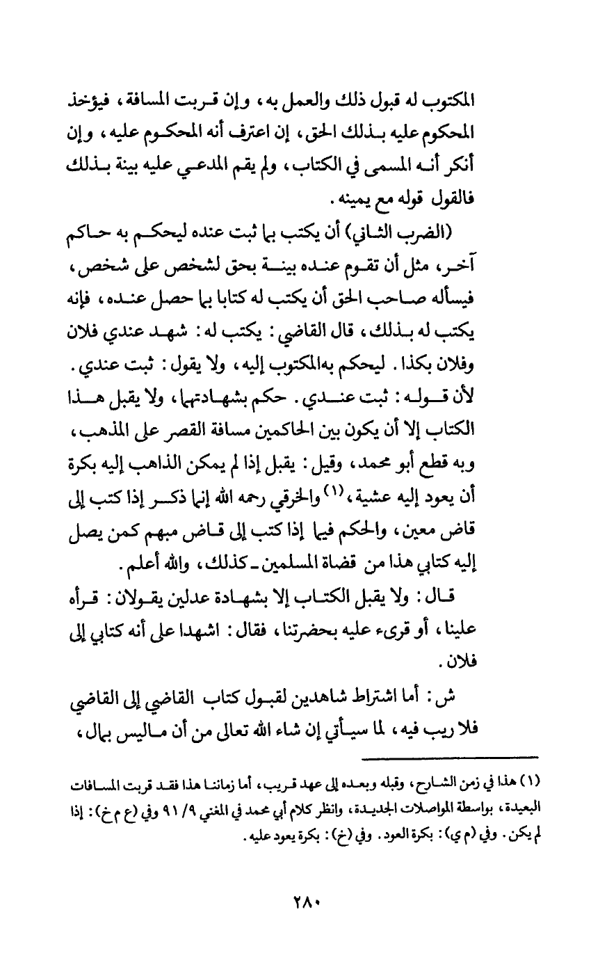 (الضرب الثاني) أن يكتب بما ثبت عنده ليحكم به حاكم آخر، مثل أن تقوم عنده بينة بحق لشخص على شخص، فيسأله صاحب الحق أن يكتب له كتابا بما حصل عنده، فإنه يكتب له بذلك، قال القاضي: يكتب له: شهد عندي فلان وفلان بكذا. ليحكم به المكتوب إليه، ولا يقول: ثبت عندي. لأن قوله: ثبت عندي. حكم بشهادتهما، ولا يقبل هذا الكتاب إلا أن يكون بين الحاكمين مسافة القصر على المذهب، وبه قطع أبو محمد، وقيل: يقبل إذا لم يمكن الذاهب إليه بكرة أن يعود إليه عشية، والخرقي - رَحِمَهُ اللَّهُ - إنما ذكر إذا كتب إلى قاض معين، والحكم فيما إذا كتب إلى قاض مبهم كمن يصل إليه كتابي هذا من قضاة المسلمين - كذلك، والله أعلم.