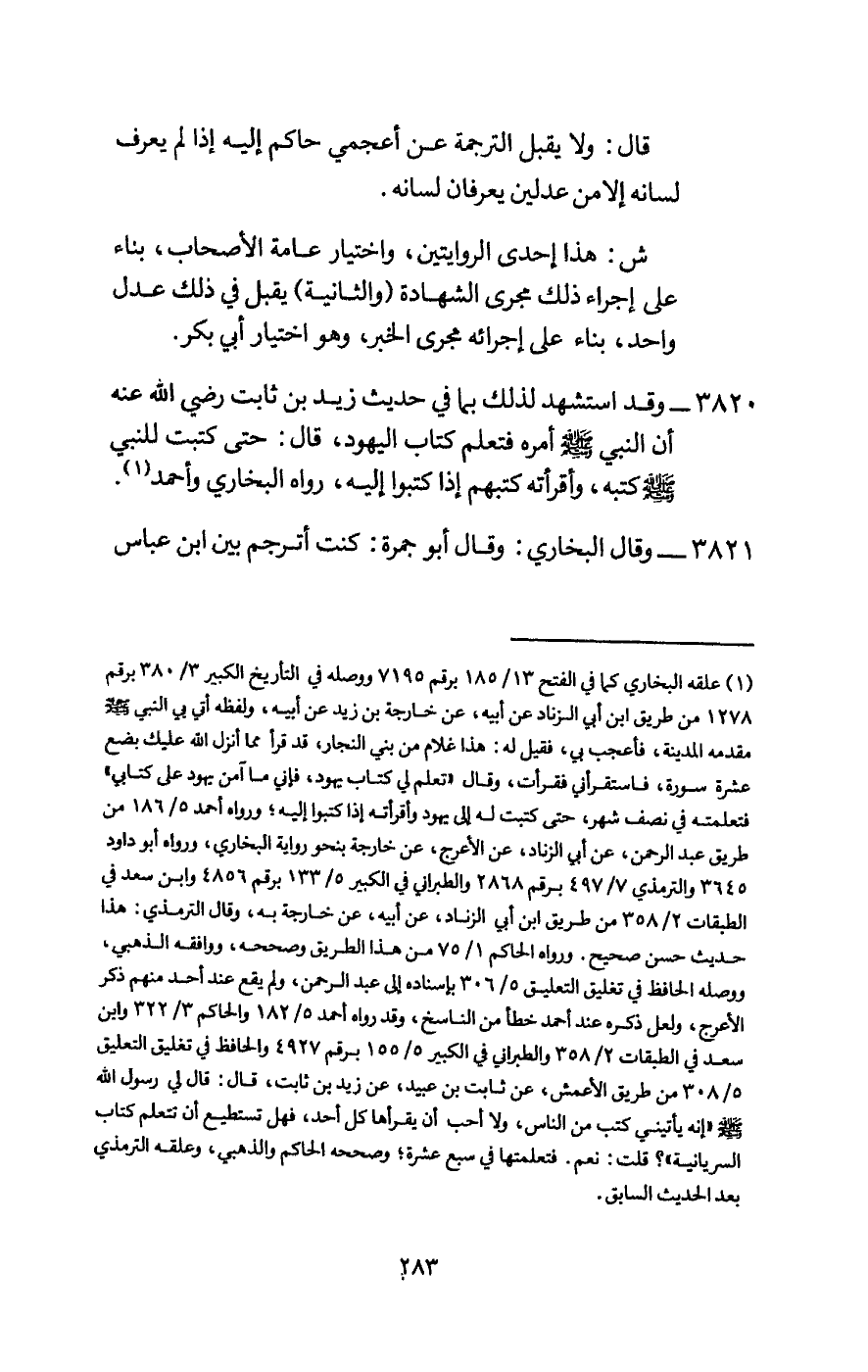 3820 - وقد استشهد لذلك بما في حديث «زيد بن ثابت - رَضِيَ اللَّهُ عَنْهُ - أن النبي - صَلَّى اللَّهُ عَلَيْهِ وَسَلَّمَ - أمره فتعلم كتاب اليهود، قال: حتى كتبت للنبي - صَلَّى اللَّهُ عَلَيْهِ وَسَلَّمَ - كتبه، وأقرأته كتبهم إذا كتبوا إليه» ، رواه البخاري وأحمد.