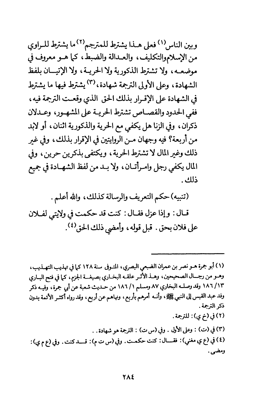 وبين الناس فعلى هذا يشترط للمترجم ما يشترط للراوي من الإسلام والتكليف، والعدالة والضبط، كما هو معروف في موضعه، ولا تشترط الذكورية ولا الحرية، ولا الإتيان بلفظ الشهادة، وعلى الأولى الترجمة شهادة، يشترط فيها ما يشترط في الشهادة على الإقرار بذلك الحق الذي وقعت الترجمة فيه، ففي الحدود والقصاص تشترط الحرية على المشهور، وعدلان ذكران، وفي الزنا هل يكفي مع الحرية والذكورية اثنان، أو لا بد من أربعة؟ فيه وجهان من الروايتين في الإقرار بذلك، وفي غير ذلك وغير المال لا تشترط الحرية، ويكتفى بذكرين حرين، وفي المال يكفي رجل وامرأتان، ولا بد من لفظ الشهادة في جميع ذلك.