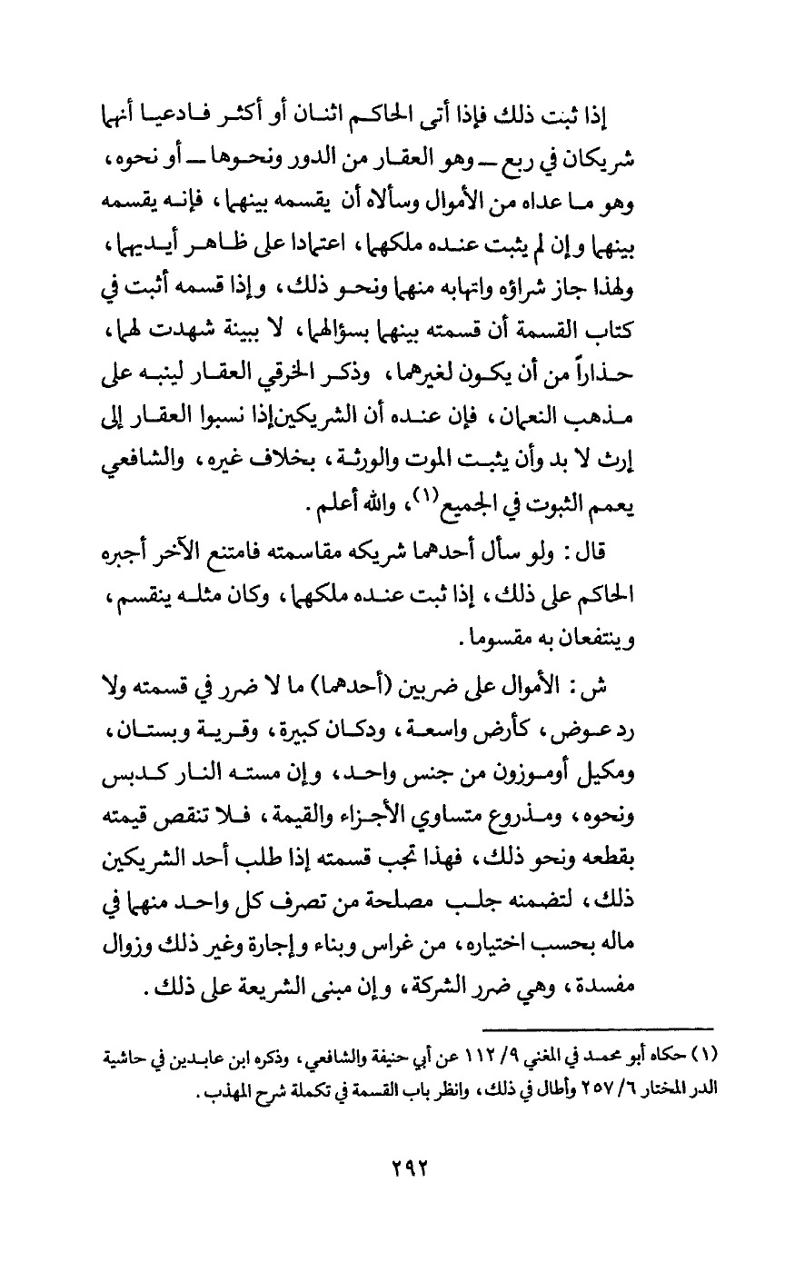 ش: الأموال على ضربين (أحدهما) ما لا ضرر في قسمته ولا رد عوض، كأرض واسعة، ودكان كبيرة، وقرية وبستان، ومكيل أو موزون من جنس واحد، وإن مسته النار كدبس ونحوه، ومذروع متساوي الأجزاء والقيمة، فلا تنقص قيمته بقطعه ونحو ذلك، فهذا تجب قسمته إذا طلب أحد الشريكين ذلك، لتضمنه جلب مصلحة من تصرف كل واحد منهما في ماله بحسب اختياره، من غراس وبناء وإجارة وغير ذلك وزوال مفسدة، وهي ضرر الشركة، وإن مبنى الشريعة على ذلك.