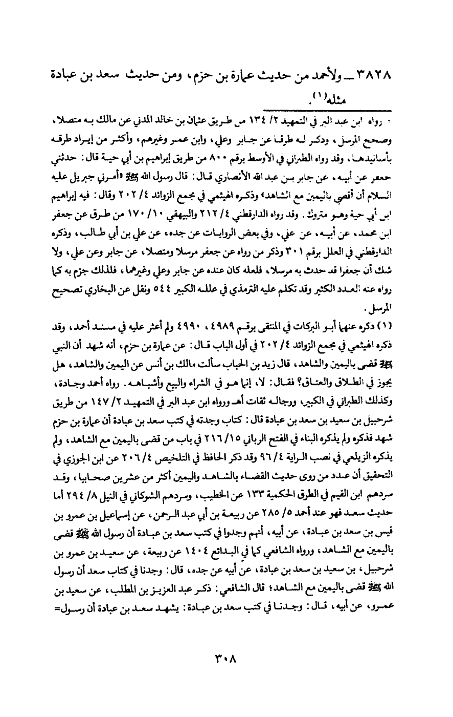 3828 - ولأحمد من حديث عمارة بن حزم، ومن حديث سعد بن عبادة مثله.