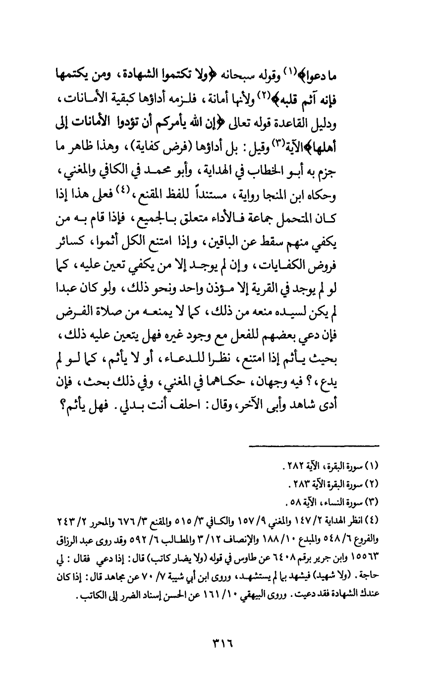 وقوله سبحانه: {وَلَا تَكْتُمُوا الشَّهَادَةَ وَمَنْ يَكْتُمْهَا فَإِنَّهُ آثِمٌ قَلْبُهُ} [البقرة: 283] ولأنها أمانة، فلزمه أداؤها كبقية الأمانات، ودليل القاعدة قَوْله تَعَالَى: {إِنَّ اللَّهَ يَأْمُرُكُمْ أَنْ تُؤَدُّوا الْأَمَانَاتِ إِلَى أَهْلِهَا} [النساء: 58] الآية وقيل: بل أداؤها (فرض كفاية) ، وهذا ظاهر ما جزم به أبو الخطاب في الهداية، وأبو محمد في الكافي والمغني، وحكاه ابن المنجا رواية، مستندا للفظ المقنع، فعلى هذا إذا كان المتحمل جماعة فالأداء متعلق بالجميع، فإذا قام به من يكفي منهم سقط عن الباقين، وإذا امتنع الكل أثموا، كسائر فروض الكفايات، وإن لم يوجد إلا من يكفي تعين عليه، كما لو لم يوجد في القرية إلا مؤذن واحد ونحو ذلك، ولو كان عبدا لم يكن لسيده منعه، من ذلك، كما لا يمنعه من صلاة الفرض فإن دعي بعضهم للفعل مع وجود غيره فهل يتعين عليه ذلك، بحيث يأثم إذا امتنع، نظرا للدعاء، أو لا يأثم، كما لو لم يدع؟ فيه وجهان، حكاهما في المغني، وفي ذلك بحث، فإن أدى شاهد وأبى الآخر، وقال: احلف أنت بدلي.