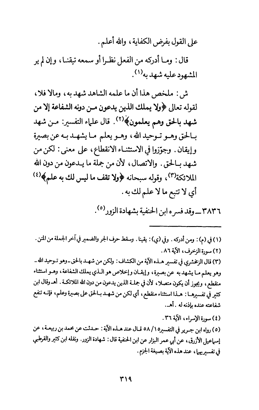 ش: ملخص هذا أن ما عمله الشاهد شهد به، وما لا فلا، لِقَوْلِهِ تَعَالَى: {وَلَا يَمْلِكُ الَّذِينَ يَدْعُونَ مِنْ دُونِهِ الشَّفَاعَةَ إِلَّا مَنْ شَهِدَ بِالْحَقِّ وَهُمْ يَعْلَمُونَ} [الزخرف: 86] .