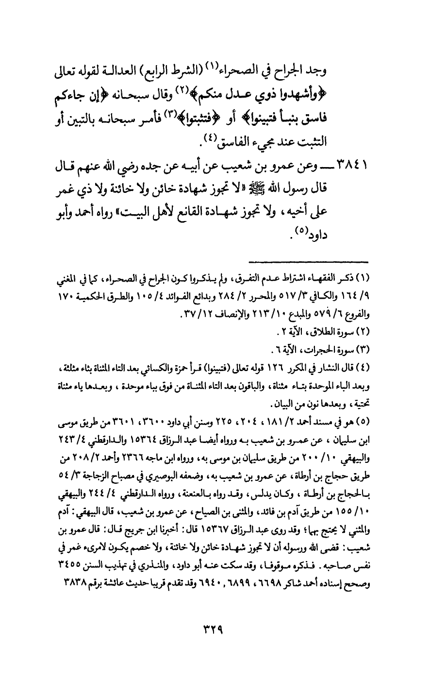 وجد الجراح في الصحراء (الشرط الرابع) العدالة لِقَوْلِهِ تَعَالَى: {وَأَشْهِدُوا ذَوَيْ عَدْلٍ مِنْكُمْ} [الطلاق: 2] وقال سبحانه: {إِنْ جَاءَكُمْ فَاسِقٌ بِنَبَإٍ فَتَبَيَّنُوا} [الحجرات: 6] أو (فتثبتوا) فأمر سبحانه بالتبين أو التثبت عند مجيء الفاسق.