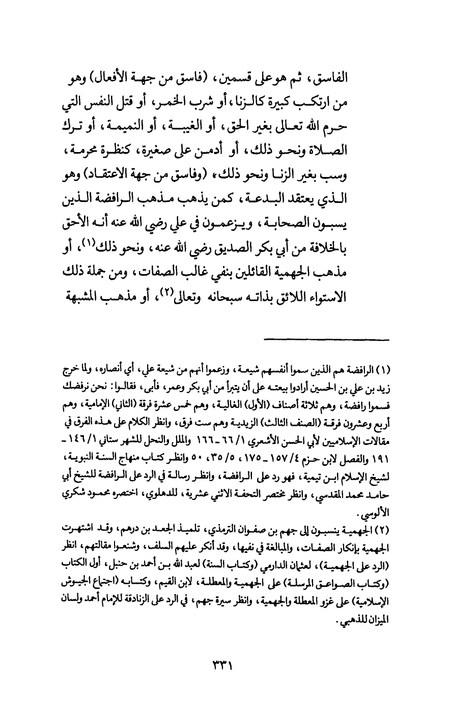 (وفاسق من جهة الاعتقاد) وهو الذي يعتقد البدعة، كمن يذهب مذهب الرافضة الذين يسبون الصحابة، ويزعمون في علي - رَضِيَ اللَّهُ عَنْهُ - أنه الأحق بالخلافة من أبي بكر الصديق - رَضِيَ اللَّهُ عَنْهُ -، ونحو ذلك، أو مذهب الجهمية القائلين بنفي غالب الصفات، ومن جملة ذلك الاستواء اللائق بذاته سبحانه وتعالى، أو مذهب المشبهة