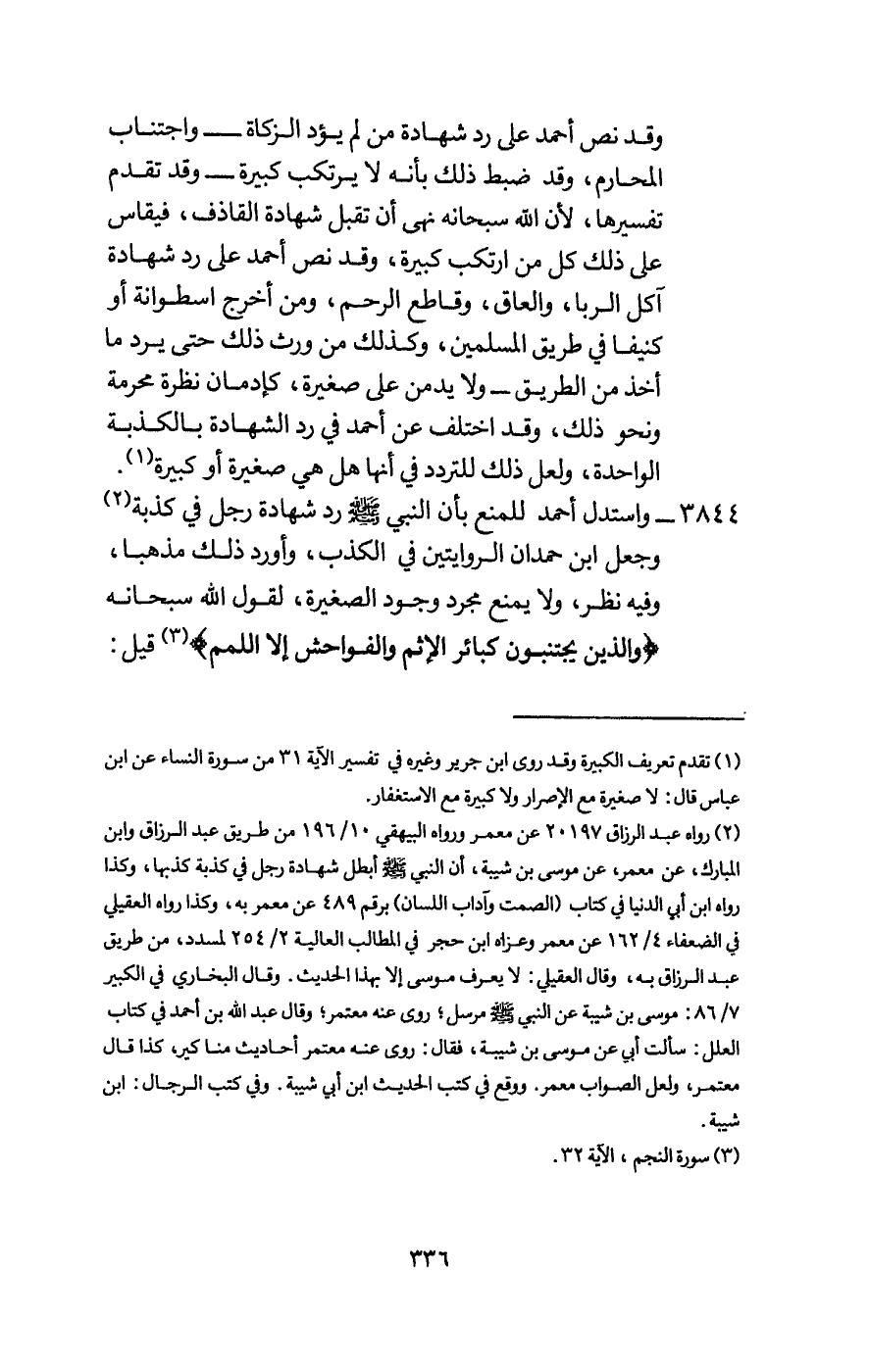 3844 - واستدل أحمد للمنع بأن «النبي - صَلَّى اللَّهُ عَلَيْهِ وَسَلَّمَ - رد شهادة رجل في كذبة» وجعل ابن حمدان الروايتين في الكذب، وأورد ذلك مذهبا، وفيه نظر، ولا يمنع مجرد وجود الصغيرة، لقول الله سبحانه {الَّذِينَ يَجْتَنِبُونَ كَبَائِرَ الْإِثْمِ وَالْفَوَاحِشَ إِلَّا اللَّمَمَ} [النجم: 32] قيل: