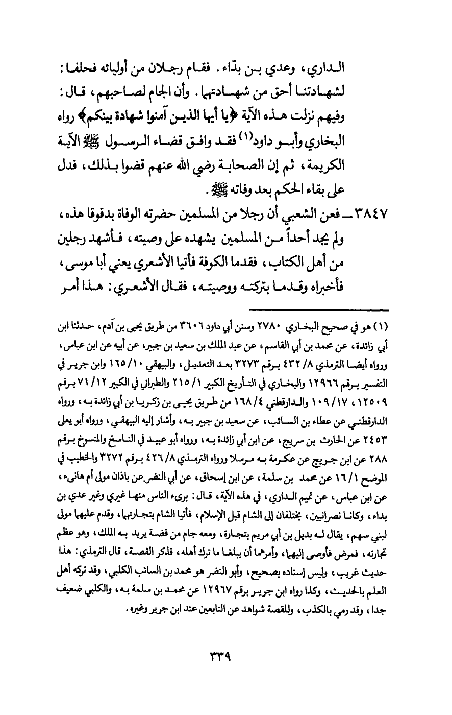 3847 - «فعن الشعبي أن رجلا من المسلمين حضرته الوفاة بدقوقا هذه، ولم يجد أحدا من المسلمين، يشهده على وصيته، فأشهد رجلين من أهل الكتاب، فقدما الكوفة فأتيا الأشعري يعني أبا موسى، فأخبراه وقدما بتركته ووصيته، فقال الأشعري: هذا أمر