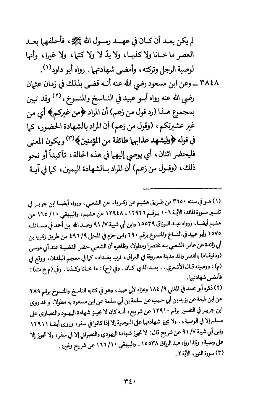 3848 - وعن ابن مسعود - رَضِيَ اللَّهُ عَنْهُ - أنه قضى بذلك في زمان عثمان - رَضِيَ اللَّهُ عَنْهُ - رواه أبو عبيد في الناسخ والمنسوخ، وقد تبين بمجموع هذا (رد قول من زعم) أن المراد {مِنْ غَيْرِكُمْ} [المائدة: 106] أي من غير عشيرتكم، (وقول من زعم) أن المراد بالشهادة الحضور، كما في قوله {وَلْيَشْهَدْ عَذَابَهُمَا طَائِفَةٌ مِنَ الْمُؤْمِنِينَ} [النور: 2] ويكون المعنى فليحضر اثنان، أي يوصي إليهما في هذه الحالة، تأكيدا أو نحو ذلك، (وقول من زعم) أن المراد بالشهادة اليمين، كما في آية