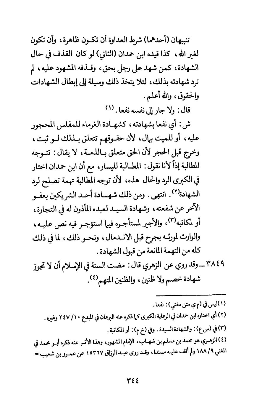 3849 - وقد روي عن الزهري قال: مضت السنة في الإسلام أن لا تجوز شهادة خصم ولا ظنين، والظنين المتهم.