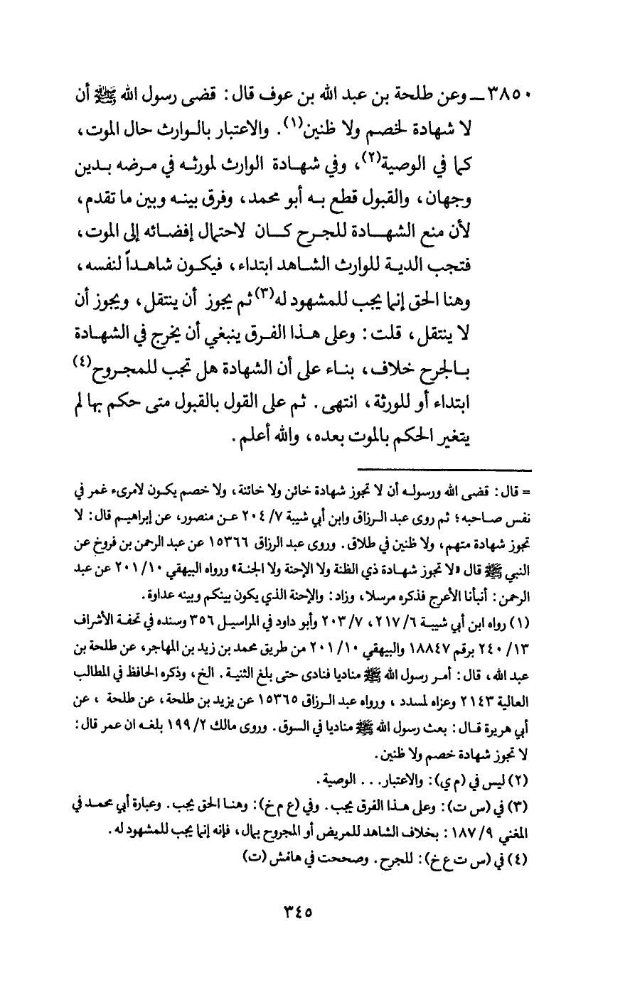 3850 - «وعن طلحة بن عبد الله بن عوف قال: قضى رسول الله - صَلَّى اللَّهُ عَلَيْهِ وَسَلَّمَ - أن لا شهادة لخصم ولا ظنين» .