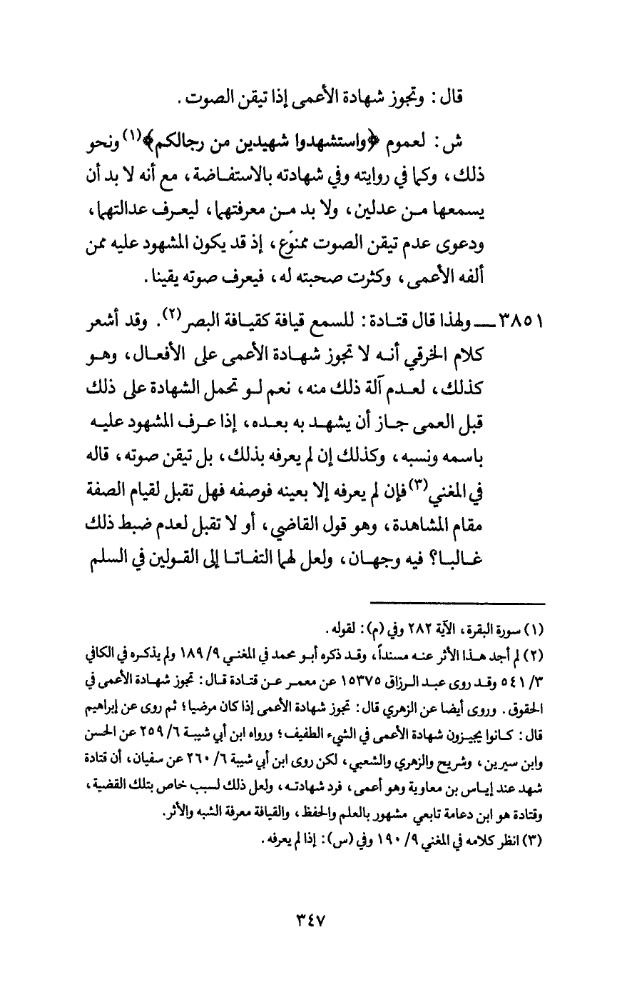 ش: لعموم: {وَاسْتَشْهِدُوا شَهِيدَيْنِ مِنْ رِجَالِكُمْ} [البقرة: 282] ونحو ذلك، وكما في روايته وفي شهادته بالاستفاضة، مع أنه لا بد أن يسمعها من عدلين، ولا بد من معرفتهما، ليعرف عدالتهما، ودعوى عدم تيقن الصوت ممنوع، إذ قد يكون المشهود عليه ممن ألفه الأعمى، وكثرت صحبته له، فيعرف صوته يقينا.