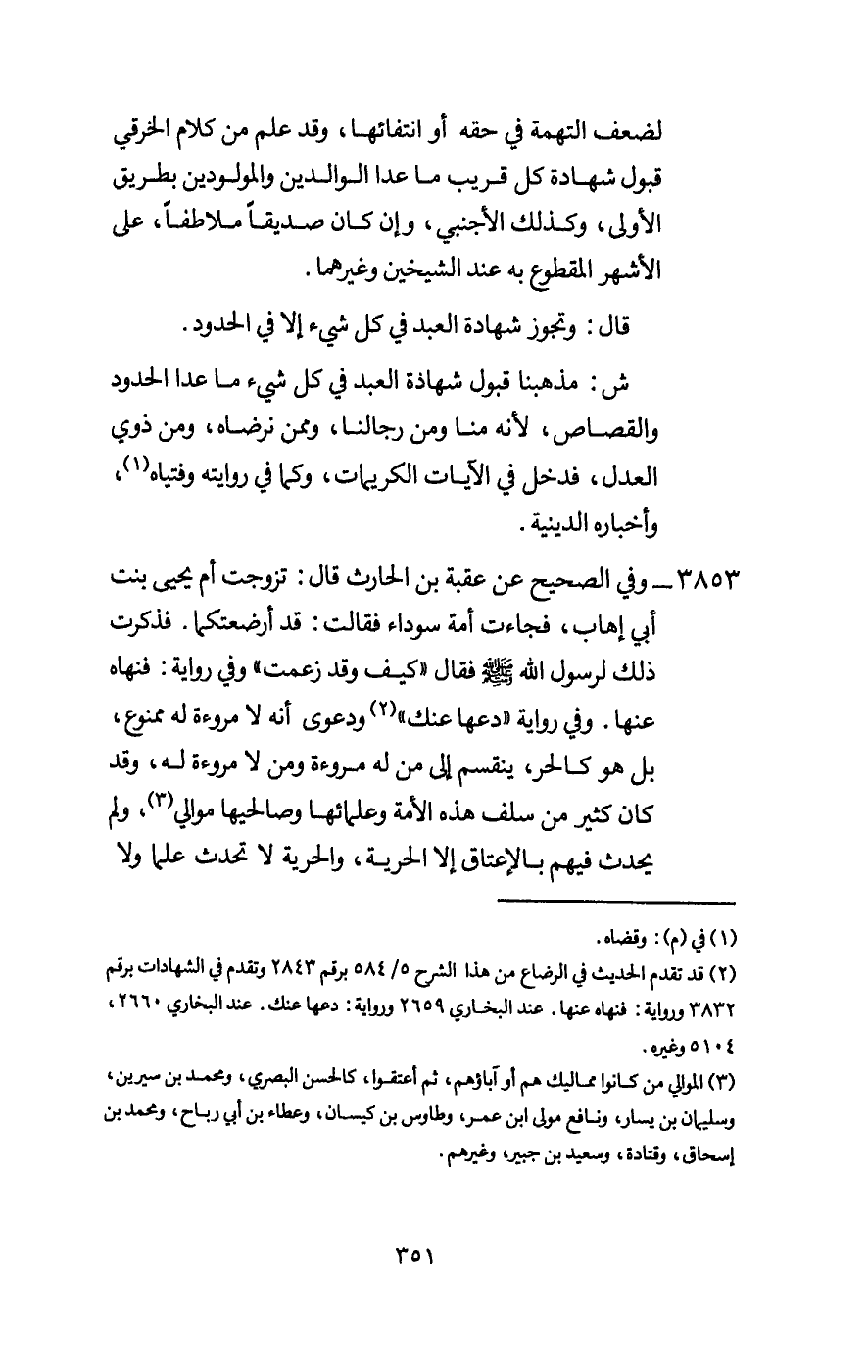 3853 - وفي الصحيح «عن عقبة بن الحارث قال: تزوجت أم يحيى بنت أبي إهاب، فجاءت أمة سوداء فقالت: قد أرضعتكما. فذكرت ذلك لرسول الله - صَلَّى اللَّهُ عَلَيْهِ وَسَلَّمَ - فقال: «كيف وقد زعمت» وفي رواية: فنهاه عنها، وفي رواية «دعها عنك» ودعوى أنه لا مروءة له ممنوع، بل هو كالحر، ينقسم إلى من له مروءة ومن لا مروءة له، وقد كان كثير من سلف هذه الأمة وعلمائها وصالحيها موالي، ولم يحدث فيهم بالإعتاق إلا الحرية والحرية لا تحدث علما ولا