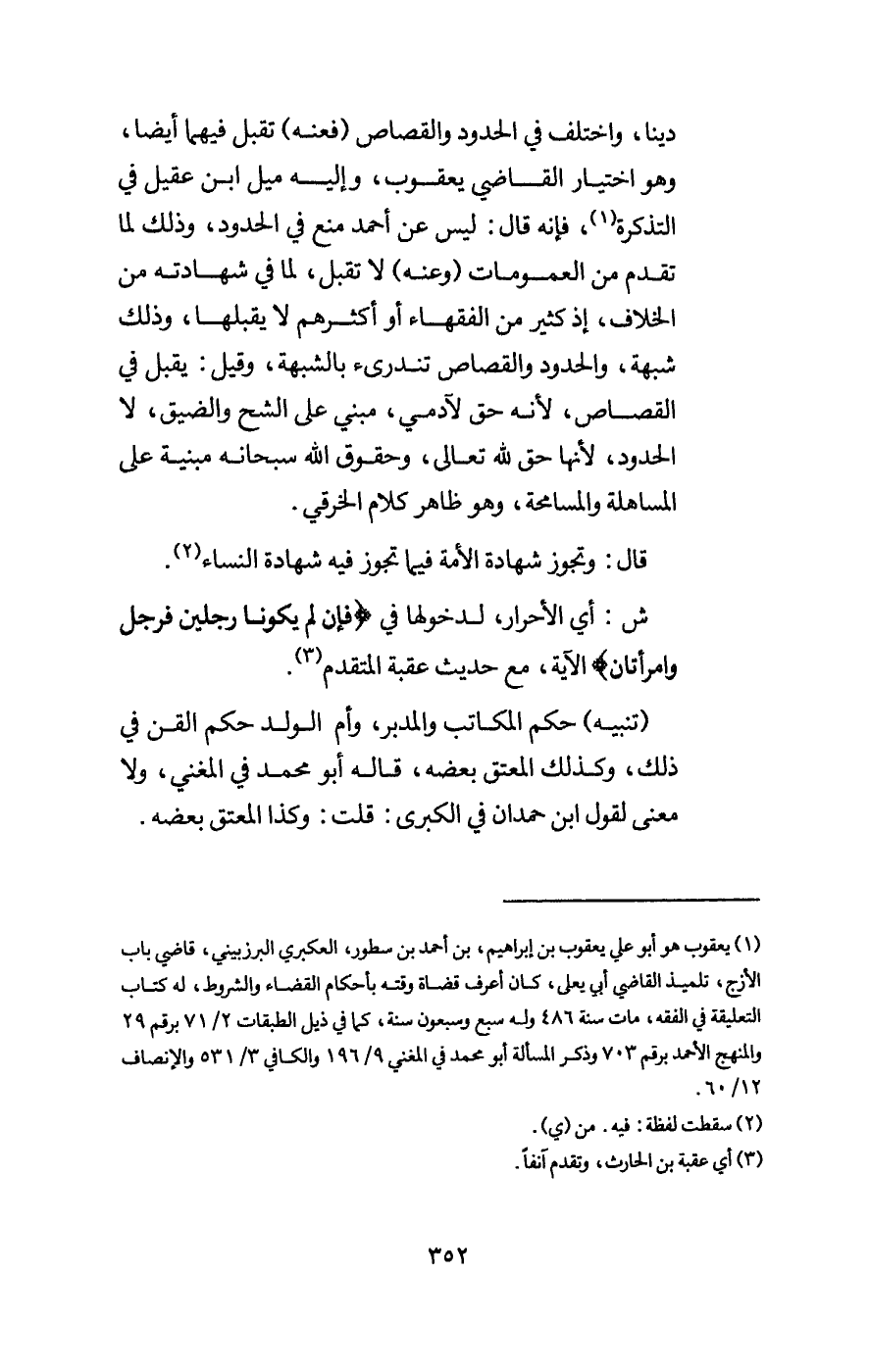 دينا، واختلف في الحدود والقصاص (فعنه) تقبل فيهما أيضا، وهو اختيار القاضي يعقوب، وإليه ميل ابن عقيل في التذكرة، فإنه قال: لي عن أحمد منع في الحدود، وذلك لما تقدم من العمومات (وعنه) لا تقبل، لما في شهادته من الخلاف، إذ كثير من الفقهاء أو أكثرهم لا يقبلها، وذلك شبهة، والحدود والقصاص تندرئ بالشبهة، وقيل: يقبل في القصاص، لأنه حق لآدمي، مبني على الشح والضيق، لا الحدود، لأنها حق لله تعالى، وحقوق الله سبحانه مبنية على المساهلة والمسامحة، وهو ظاهر كلام الخرقي.