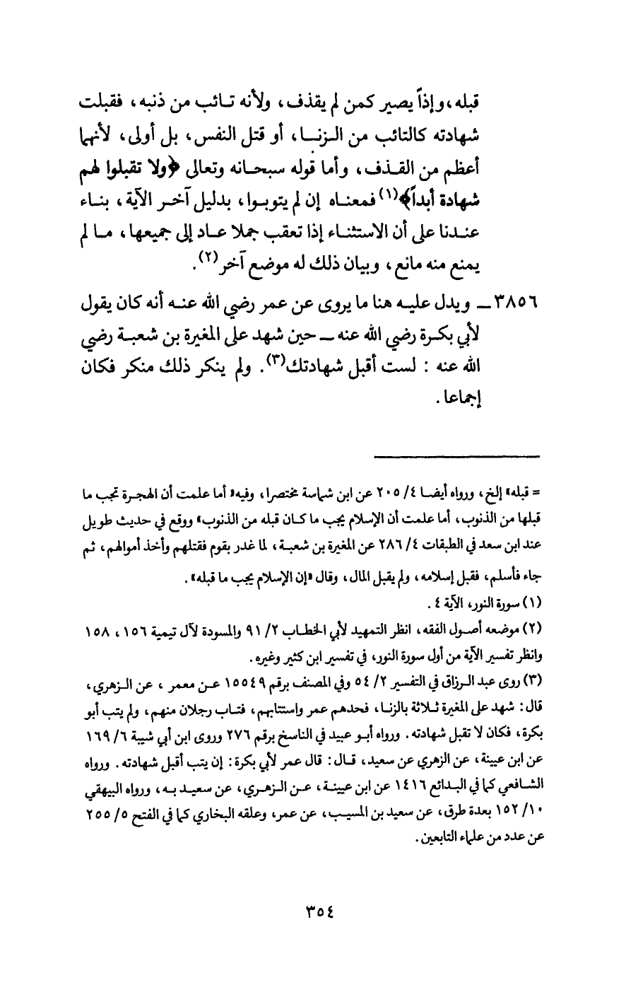 3856 - ويدل عليه هنا ما يروى عن عمر - رَضِيَ اللَّهُ عَنْهُ - أنه كان يقول لأبي بكرة - رَضِيَ اللَّهُ عَنْهُ - حين شهد على المغيرة به شعبة - رَضِيَ اللَّهُ عَنْهُ -: لست أقبل شهادتك.