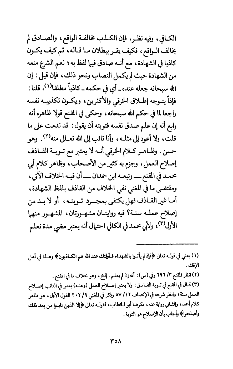 وظاهر كلام الخرقي أنه لا يعتبر مع توبة القاذف إصلاح العمل، وجزم به كثير من الأصحاب، وظاهر كلام أبي محمد في المقنع - وتبعه ابن حمدان - أن فيه الخلاف الآتي، ومقتضى ما في المغني نفي الخلاف من القاذف بلفظ الشهادة، أما غير القاذف فهل يكتفى بمجرد توبته، أو لا بد من إصلاح عمله سنة؟ فيه روايتان مشهورتان، المشهور منهما الأول، ولأبي محمد في الكافي احتمال أنه يعتبر مضي مدة نعلم
