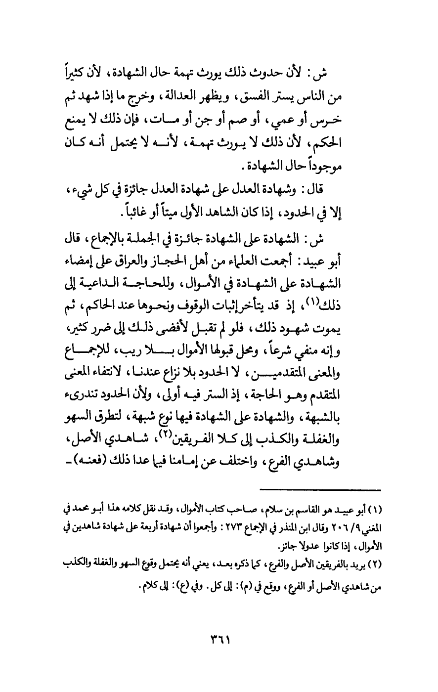 ش: الشهادة على الشهادة جائزة في الجملة بالإجماع، قال أبو عبيد: أجمعت العلماء من أهل الحجاز والعراق على إمضاء الشهادة على الشهادة في الأموال، وللحاجة الداعية إلى ذلك، إذ قد يتأخر إثبات الوقوف ونحوها عند الحاكم، ثم يموت شهود ذلك، فلو لم تقبل لأفضى ذلك إلى ضرر كثير، وإنه منفي شرعا، ومحل قبولها الأموال بلا ريب، للإجماع والمعنى المتقدمين، لا الحدود بلا نزاع عندنا، لانتفاء المعنى المتقدم وهو الحاجة، إذ الستر فيه أولى، ولأن الحدود تندرئ بالشبهة، والشهادة على الشهادة فيها نوع شبهة، لتطرق السهو والغفلة والكذب إلى كلا الفريقين، شاهدي الأصل، وشاهدي الفرع، واختلف عن إمامنا فيما عدا ذلك (فعنه) -