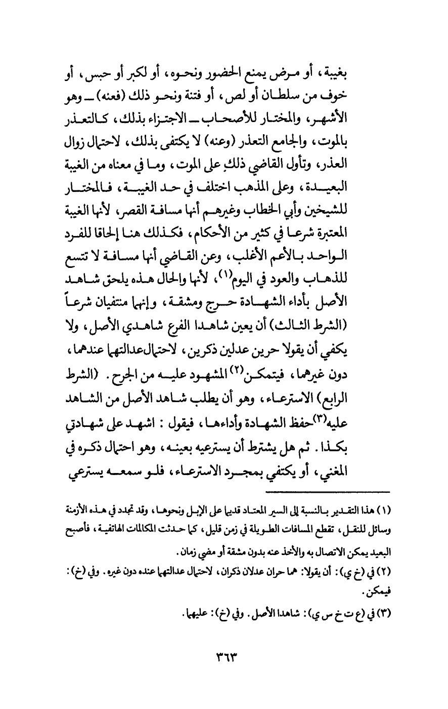 بغيبة، أو مرض يمنع الحضور ونحوه، أو لكبر أو حبس، أو خوف من سلطان أو لص، أو فتنة ونحو ذلك (فعنه) - وهو الأشهر، والمختار للأصحاب - الاجتزاء بذلك، كالتعذر بالموت، والجامع التعذر (وعنه) لا يكتفى بذلك، لاحتمال زوال العذر، وتأول القاضي ذلك على الموت، وما في معناه من الغيبة البعيدة، وعلى المذهب اختلف في حد الغيبة، فالمختار للشيخين وأبي الخطاب وغيرهم أنها مسافة القصر، لأنها الغيبة المعتبرة شرعا في كثير من الأحكام، فكذلك هنا إلحاقا للفرد الواحد بالأعم الأغلب، وعن القاضي أنها مسافة لا تتسع للذهاب والعود في اليوم، لأنها والحال هذه يلحق شاهد الأصل بأداء الشهادة حرج ومشقة، وإنهما منتفيان شرعا.