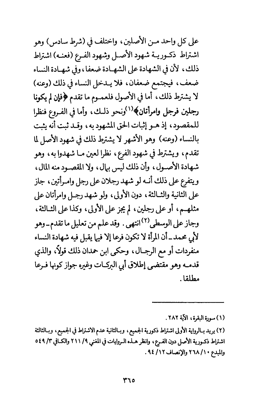 وقد علم من تعليل ما تقدم - وهو لأبي محمد - أن المرأة لا تكون فرعا إلا فيما يقبل فيه شهادة النساء منفردات أو مع الرجال، وحكى ابن حمدان ذلك قولا، والذي قدمه وهو مقتضى إطلاق أبي البركات وغيره جواز كونها فرعا مطلقا.