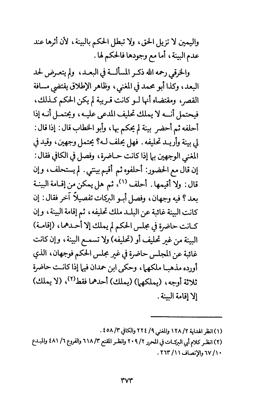 والخرقي - رَحِمَهُ اللَّهُ - ذكر المسألة في البعد، ولم يتعرض لحد البعد، وكذا أبو محمد في المغني، وظاهر الإطلاق يقتضي مسافة القصر، ومقتضاه أنها لو كانت قريبة لم يكن الحكم كذلك، فيحتمل أنه لا يملك تحليف المدعى عليه، ويحتمل أنه إذا أحلفه ثم أحضر بينة لم يحكم بها، وأبو الخطاب قال: إذا قال: لي بينة وأريد تحليفه. فهل يحلف له؟ يحتمل وجهين، وقيد في المغني الوجهين بما إذا كانت حاضرة، وفصل في الكافي فقال: إن قال مع الحضور: أحلفوه ثم أقيم بينتي، لم يستحلف، وإن قال: ولا أقيمها. أحلف، ثم هل يمكن من إقامة البينة بعد؟ فيه وجهان، وفصل أبو البركات تفصيلا آخر فقال: إن كانت البينة غائبة عن البلد ملك تحليفه، ثم إقامة البينة، وإن كانت حاضرة في مجلس الحكم لم يملك إلا أحدهما.